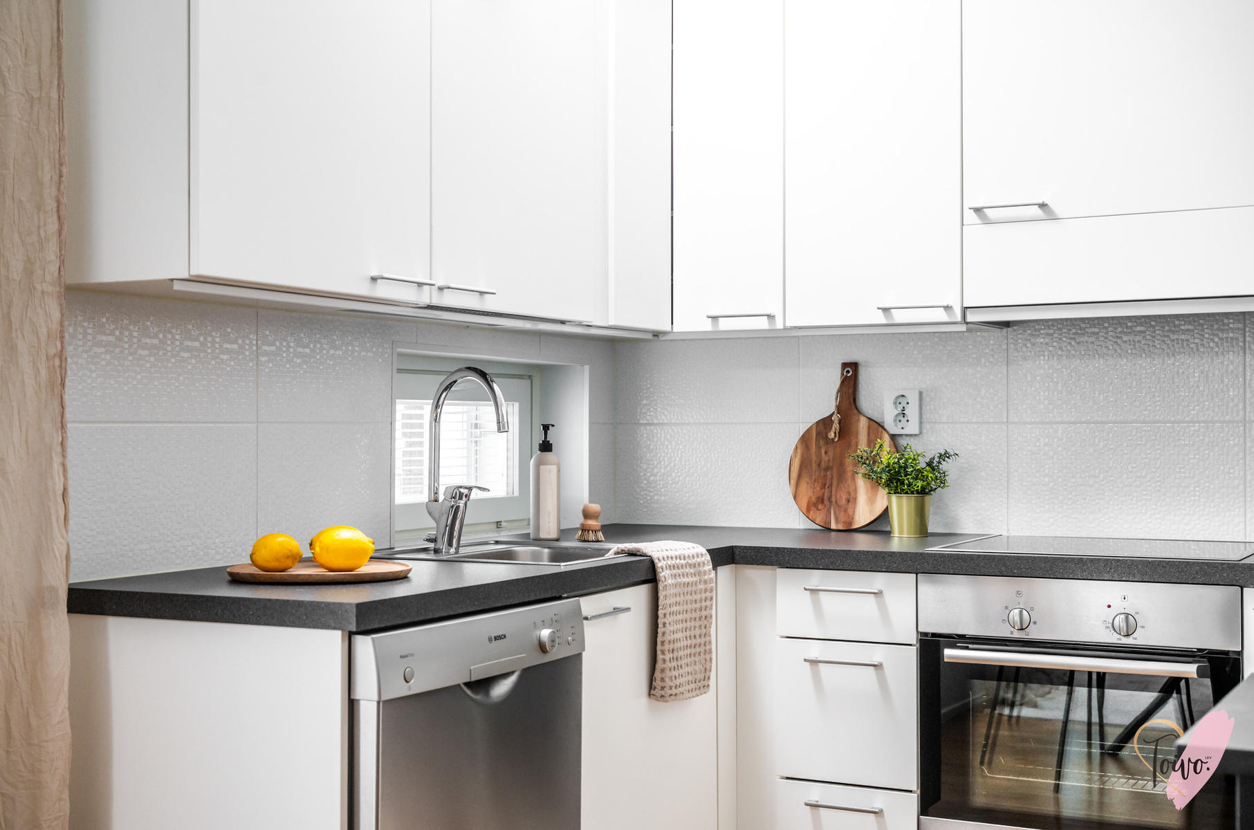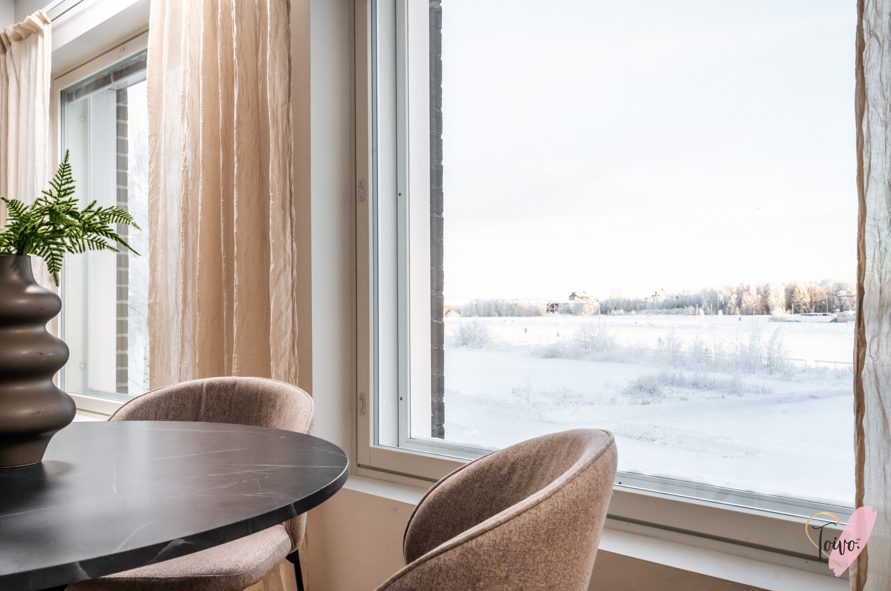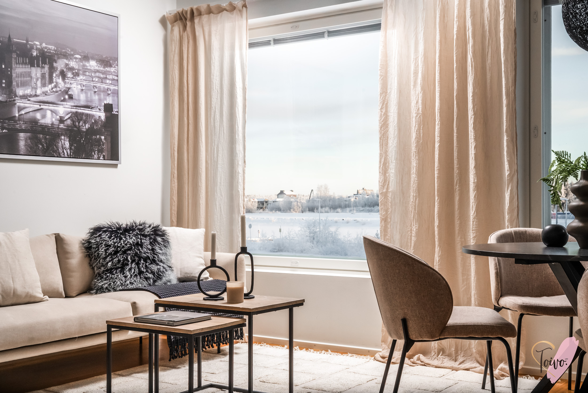 Keittiö hurmaa U-muotoisella pohjaratkaisullaan, jossa valkoiset kaapistot ja tummat työtasot muodostavat ajattoman tyylikkään kokonaisuuden. Vaakaikkunasta avautuva näkymä Toppilansalmen suuntaan tuo tilaan luonnonvaloa ja lisää avaruuden tuntua. Olohuoneen suuret maisemaikkunat päästävät valon tulvimaan sisään ja jatkuvat saumattomasti ruokailutilaan, luoden avaran ja viihtyisän sydämen kodille.