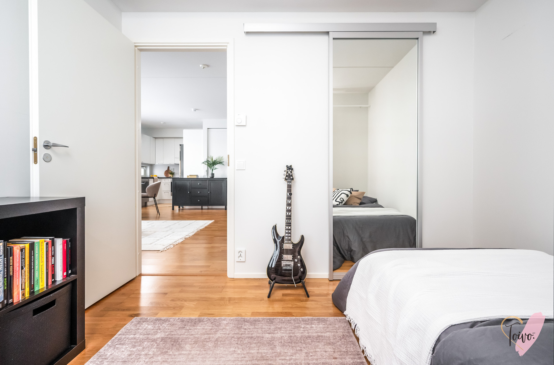 Tämä koti toivottaa tervetulleeksi eteiseen, jossa peililiukuovelliset kaapistot kätkevät sisäänsä käytännöllistä säilytystilaa.