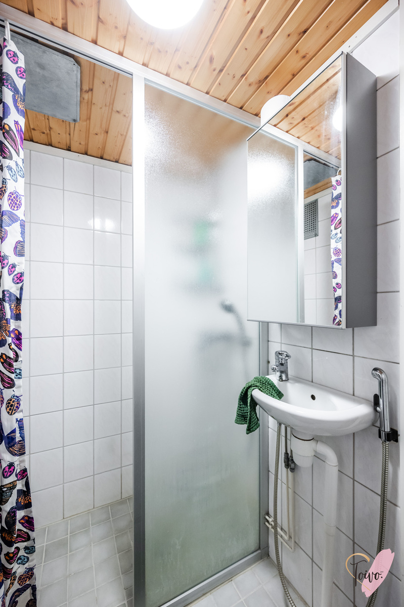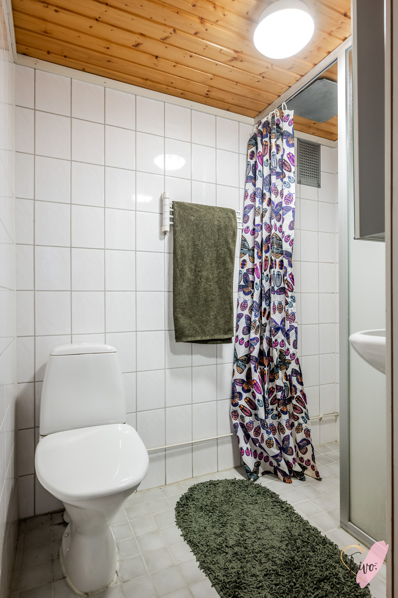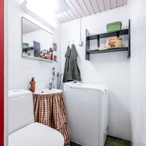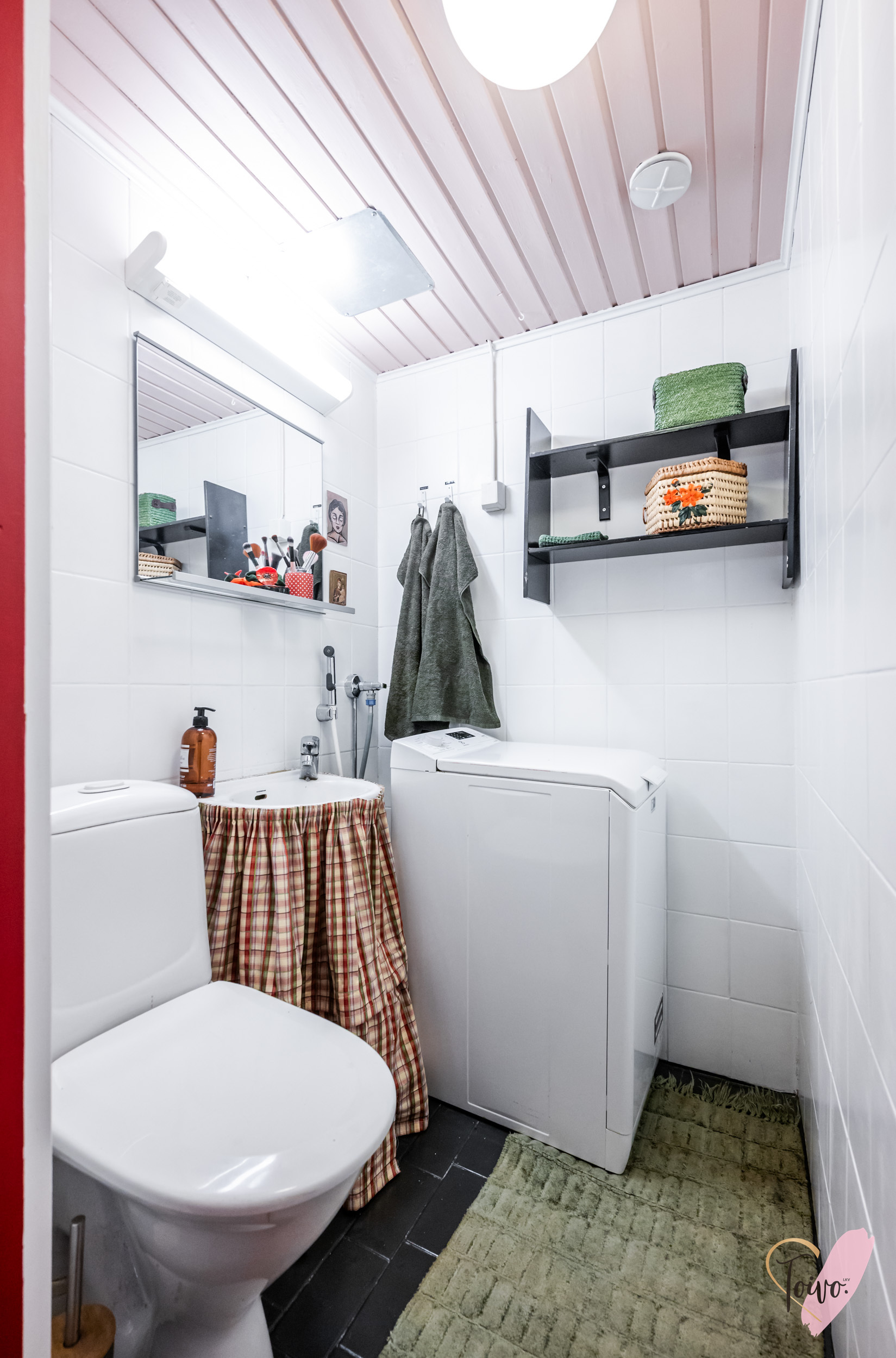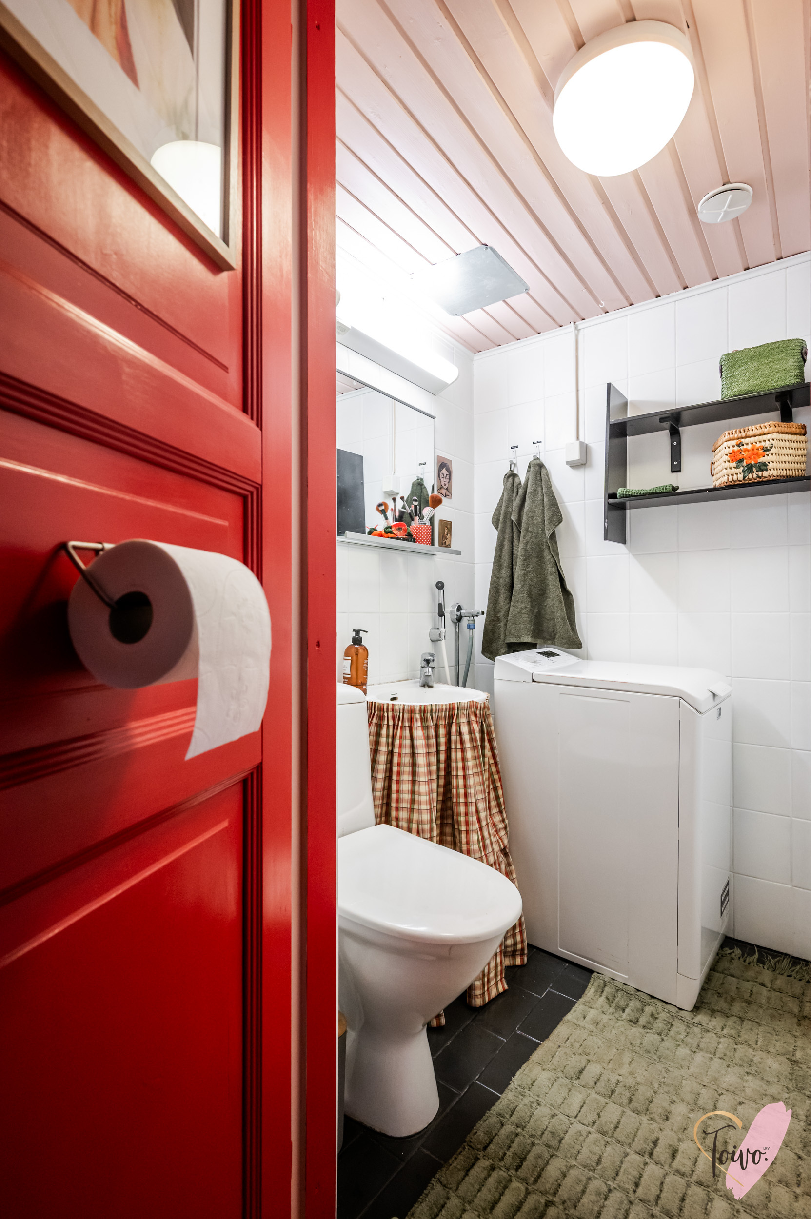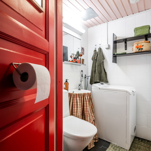 Asunnossa on erillinen wc, jonka yhteydessä on hyvin tilaa pyykkikoneelle. Kokonaisuus on käytännöllinen, mutta säilyttää rakennuksen alkuperäisen hengen tavalla, joka tuntuu aidolta ja sopusointuiselta.