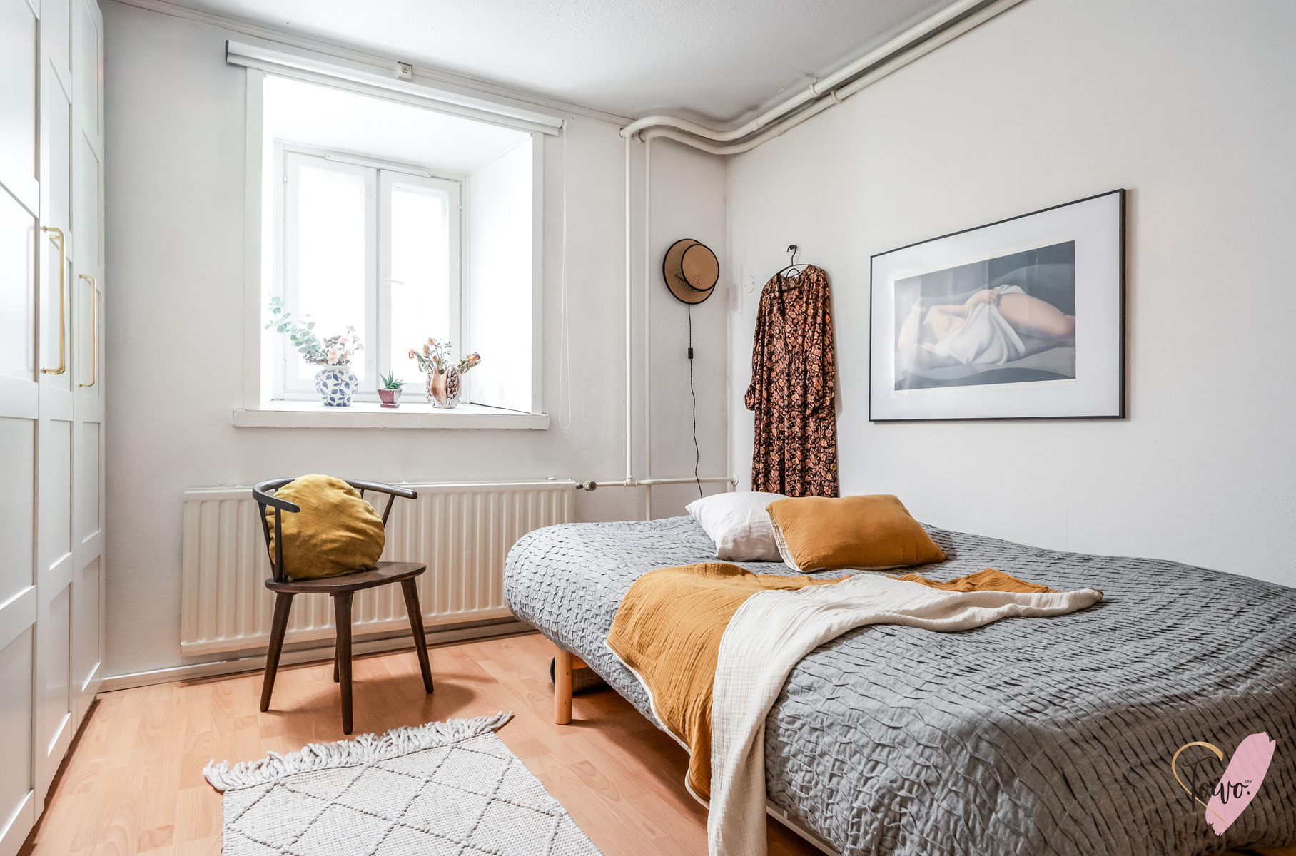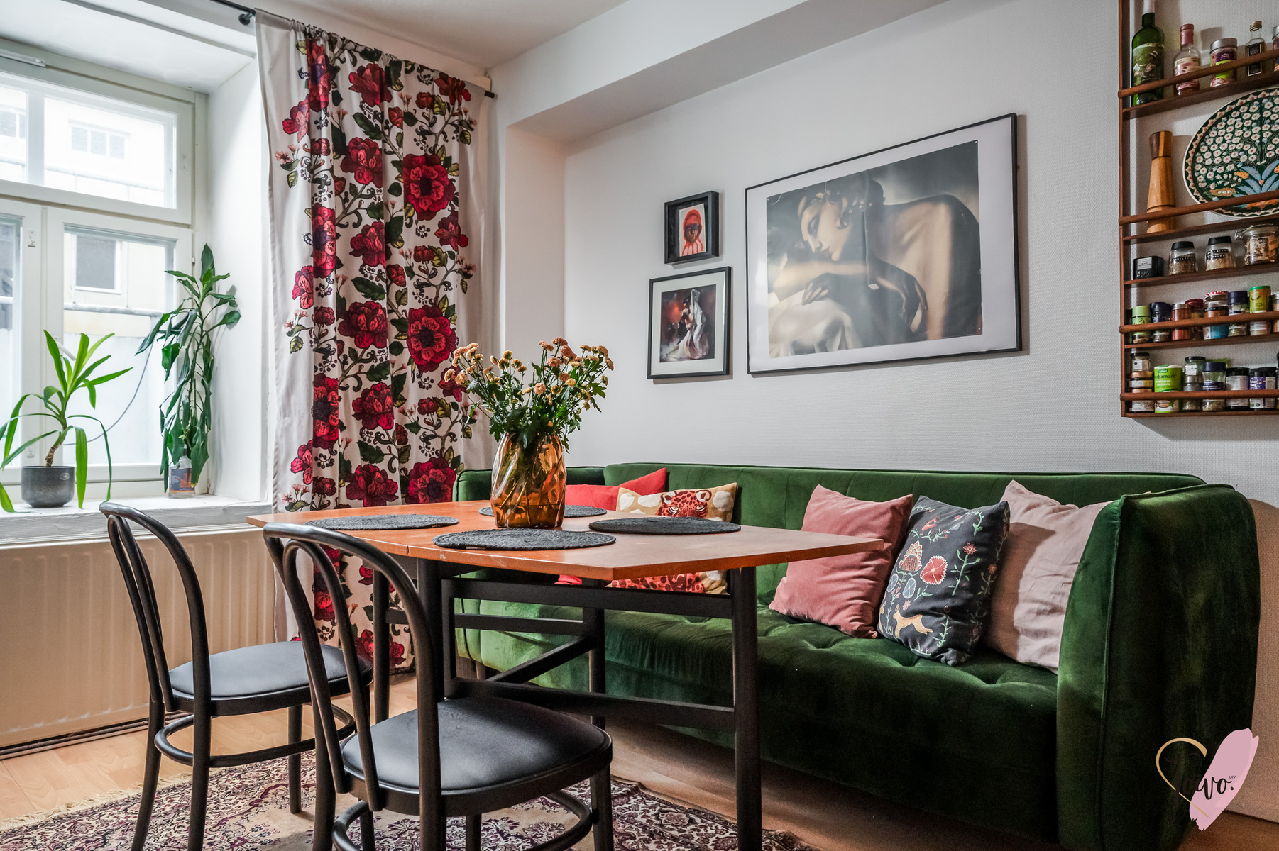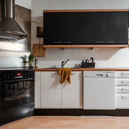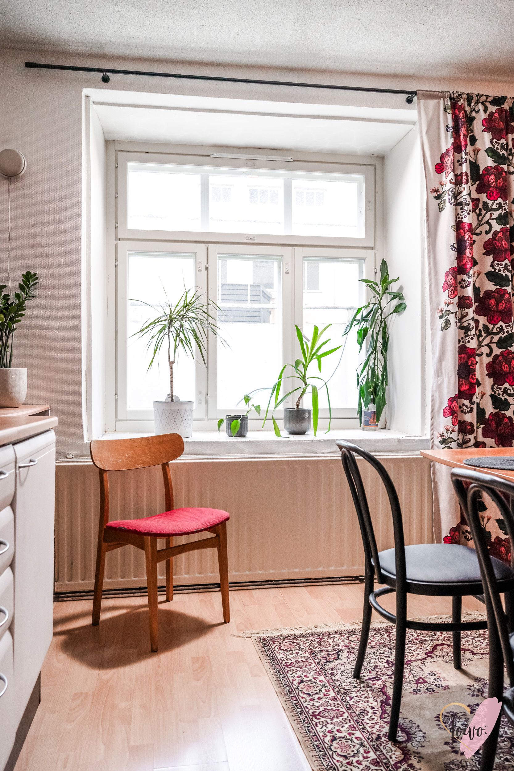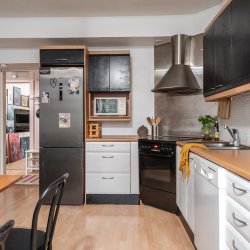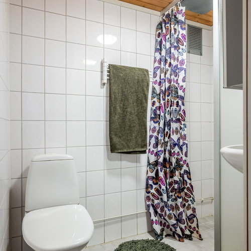Asunnossa on erillinen wc, jonka yhteydessä on hyvin tilaa pyykkikoneelle. Kokonaisuus on käytännöllinen, mutta säilyttää rakennuksen alkuperäisen hengen tavalla, joka tuntuu aidolta ja sopusointuiselta.