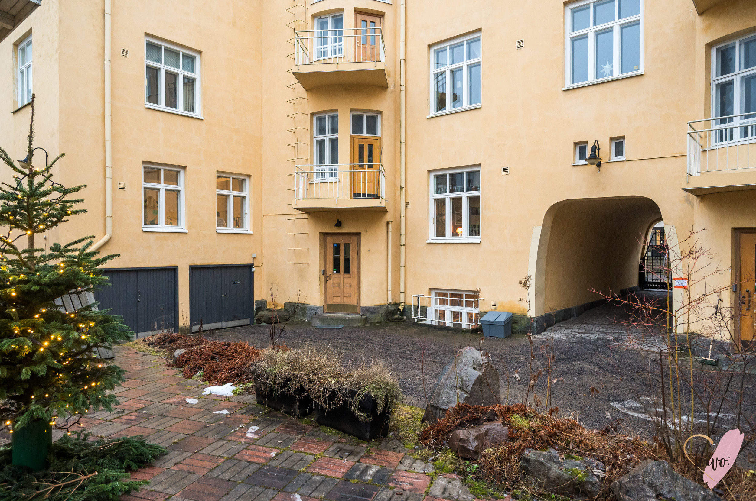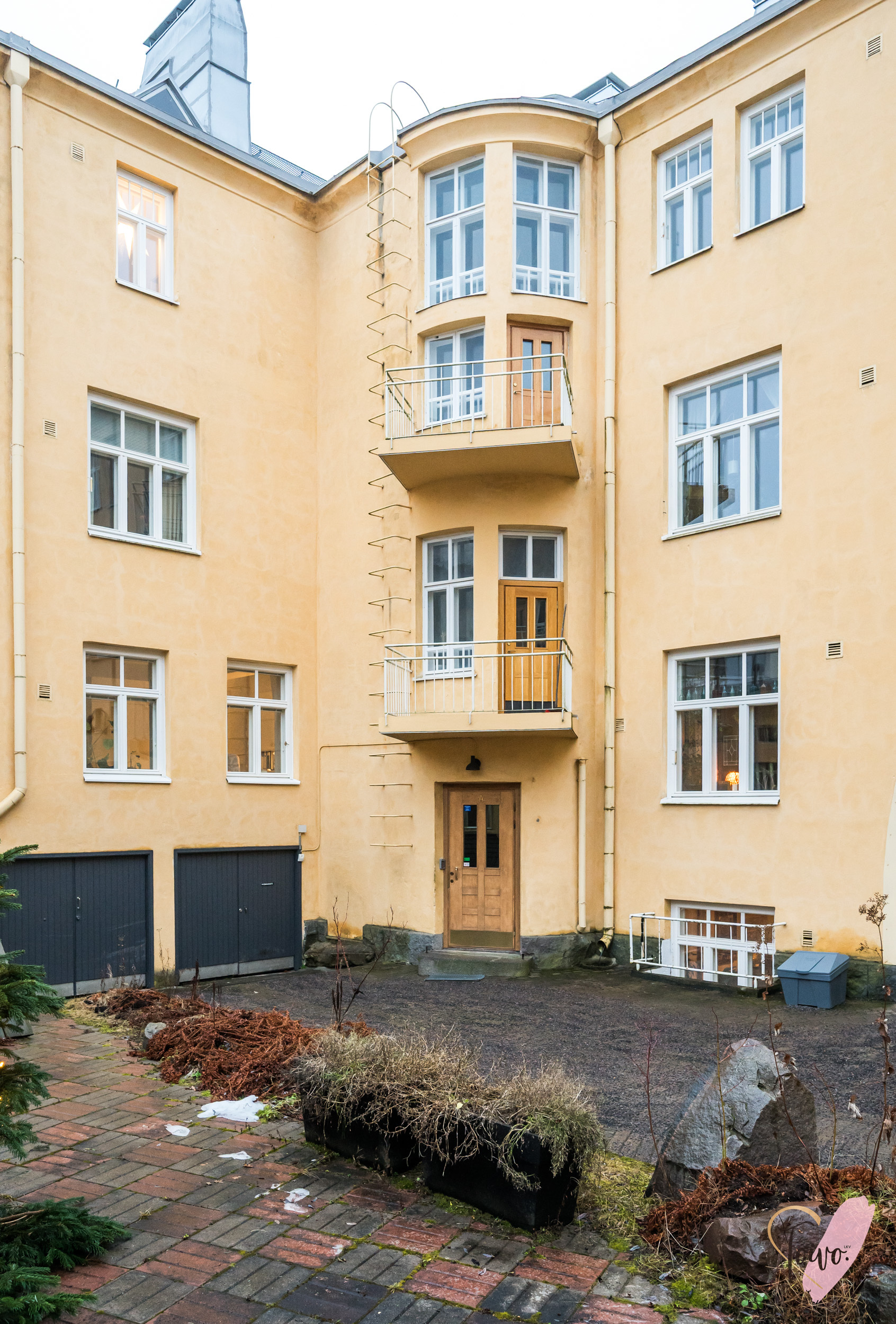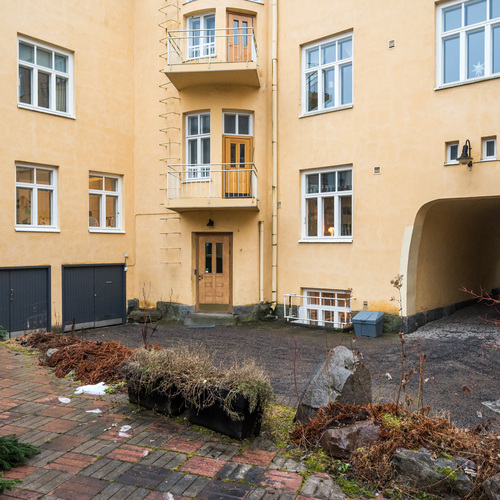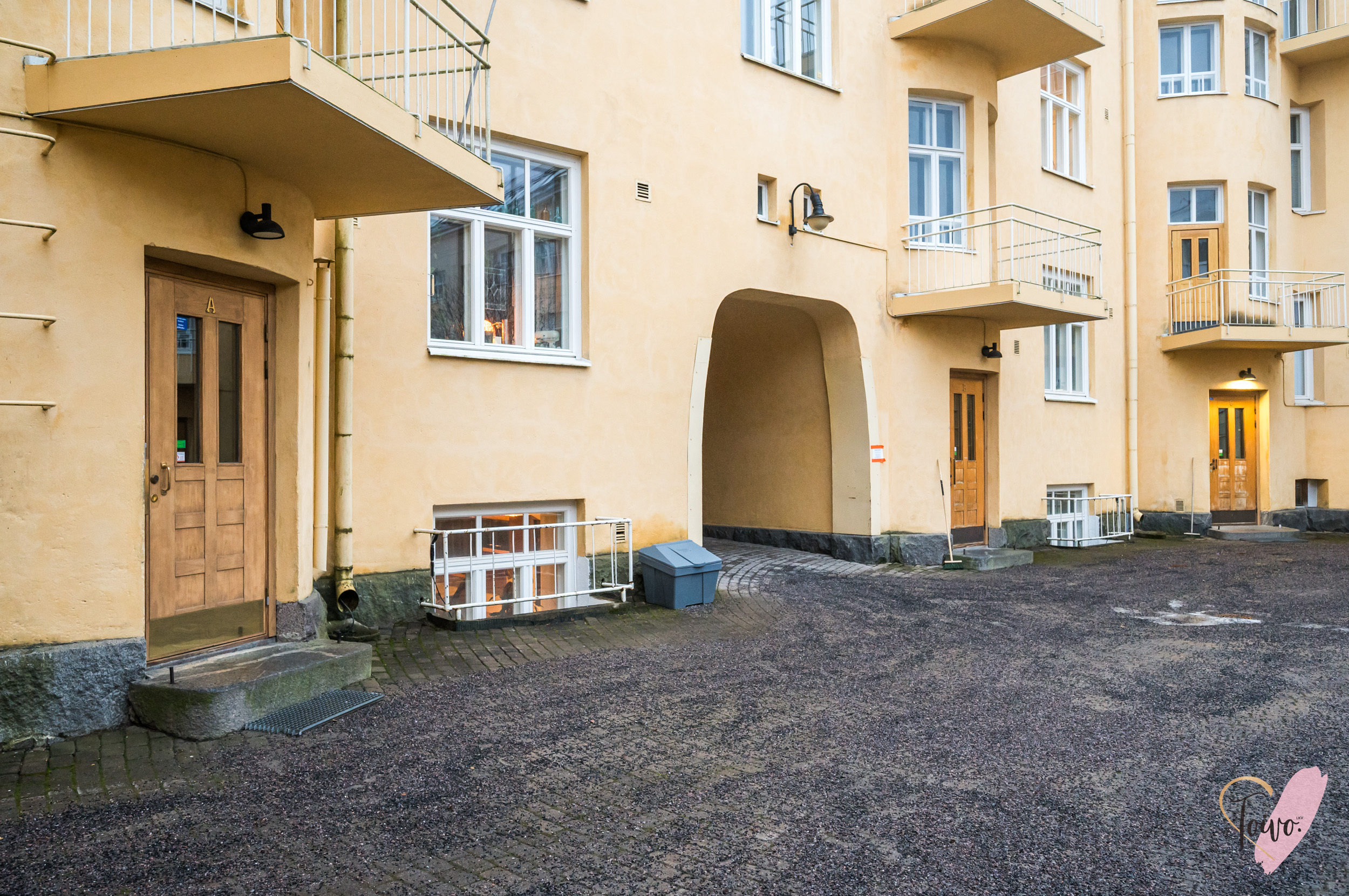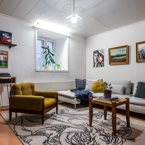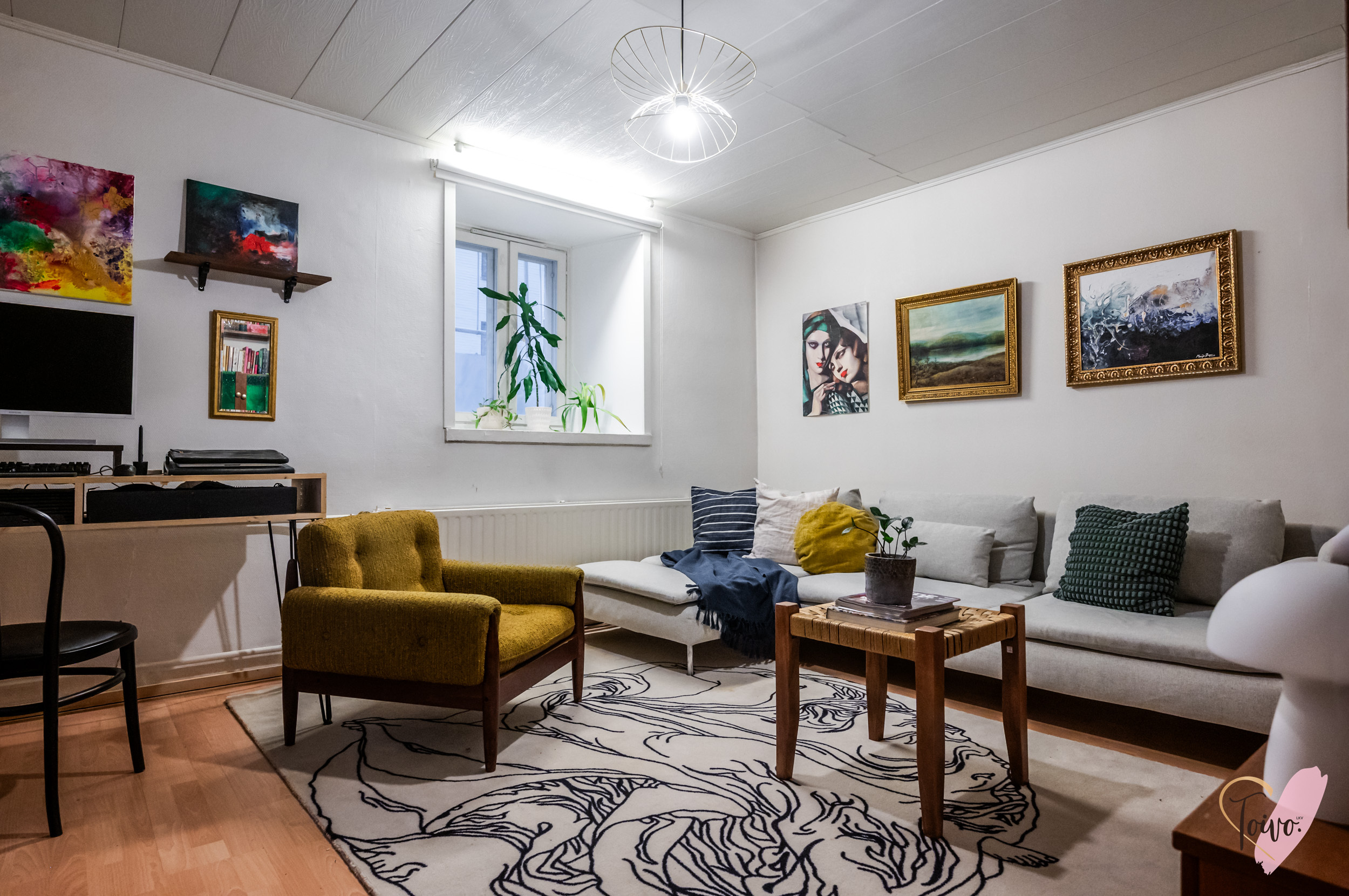Vuonna 1906 valmistunut Tuomitalo kantaa yli satavuotista tarinaansa kauniisti ja henkii ajankuvaa, jota ei voi rakentaa uudelleen. Tämä kellarikerroksen tilava kaksio kätkee sisäänsä tunnelman, joka rauhoittaa heti kynnyksen ylittäessä. Eteinen vastaanottaa lempeästi ja ohjaa kulkijan ensin makuuhuoneeseen, jossa reilut kaapistot ja oma sisäänkäynti kylpyhuoneeseen tuovat arkeen helppoutta ja sujuvaa rytmiä. Makuuhuoneen tunnelma on seesteinen ja hiljainen, aivan kuin seinät kantaisivat menneiden aikojen rytmiä.