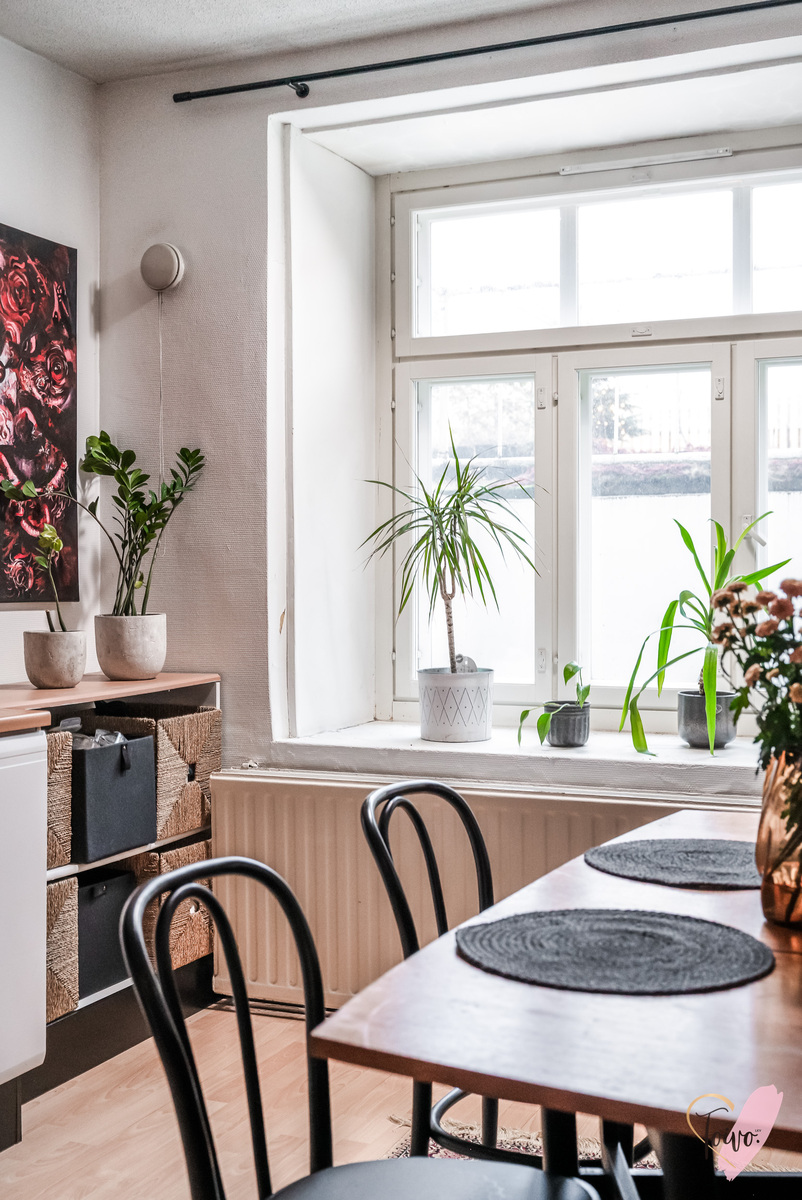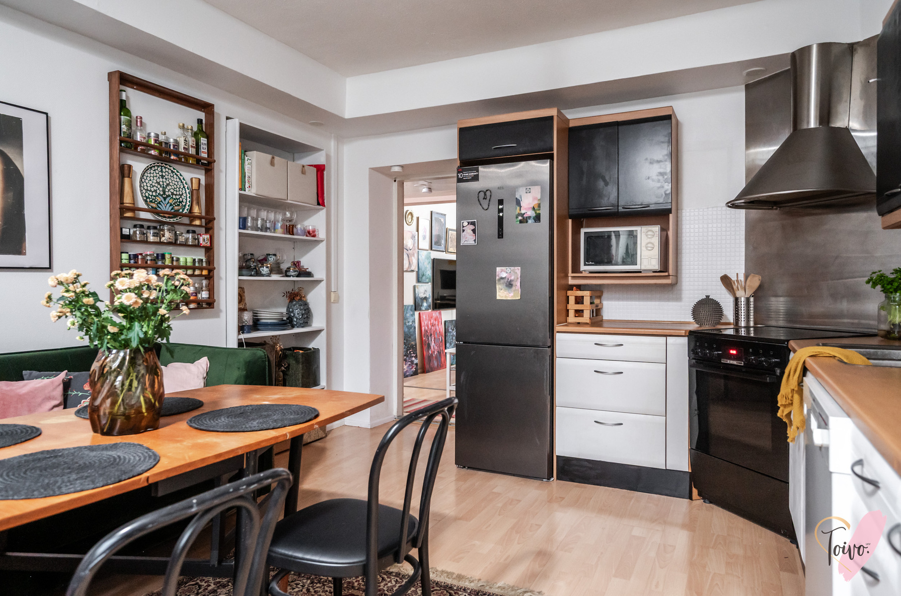 Eteisen jatkeena on sisäpihan puolelle avautuva keittiö. Tämä keittiö on erityinen; siellä on tilat, joista nauttii niin arjen kokkaaja kuin vaativampikin kotikokki. Työskentelytilaa on runsaasti ja suurelle ruokapöydälle on selkeä oma paikkansa. Sisäpihan valo siivilöityy kauniisti isosta ikkunasta ja luo tilaan lämpimän, kodikkaan tunnelman.
