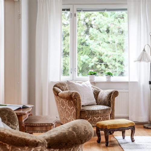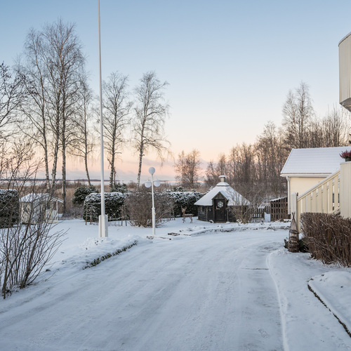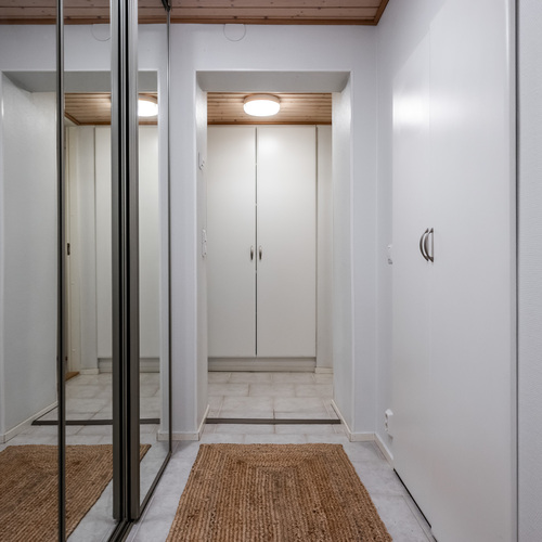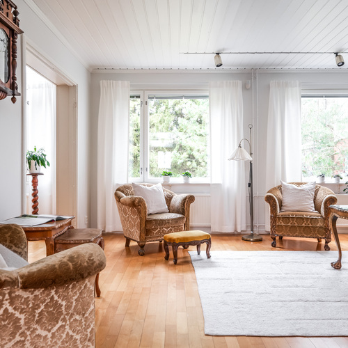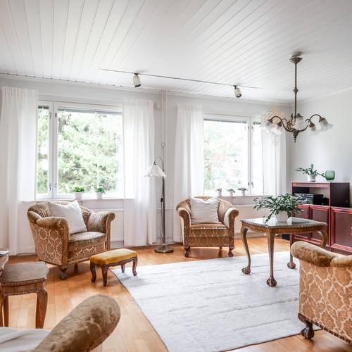Varusteet: kaapistot, sälekaihtimet/rullaverhot, verhotangot, keskuspölynimuri, hälytys- /valvontajärjestelmä, matontamppausteline, pyykinkuivausteline, jätesäiliö, istutukset