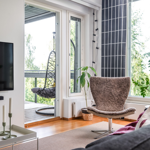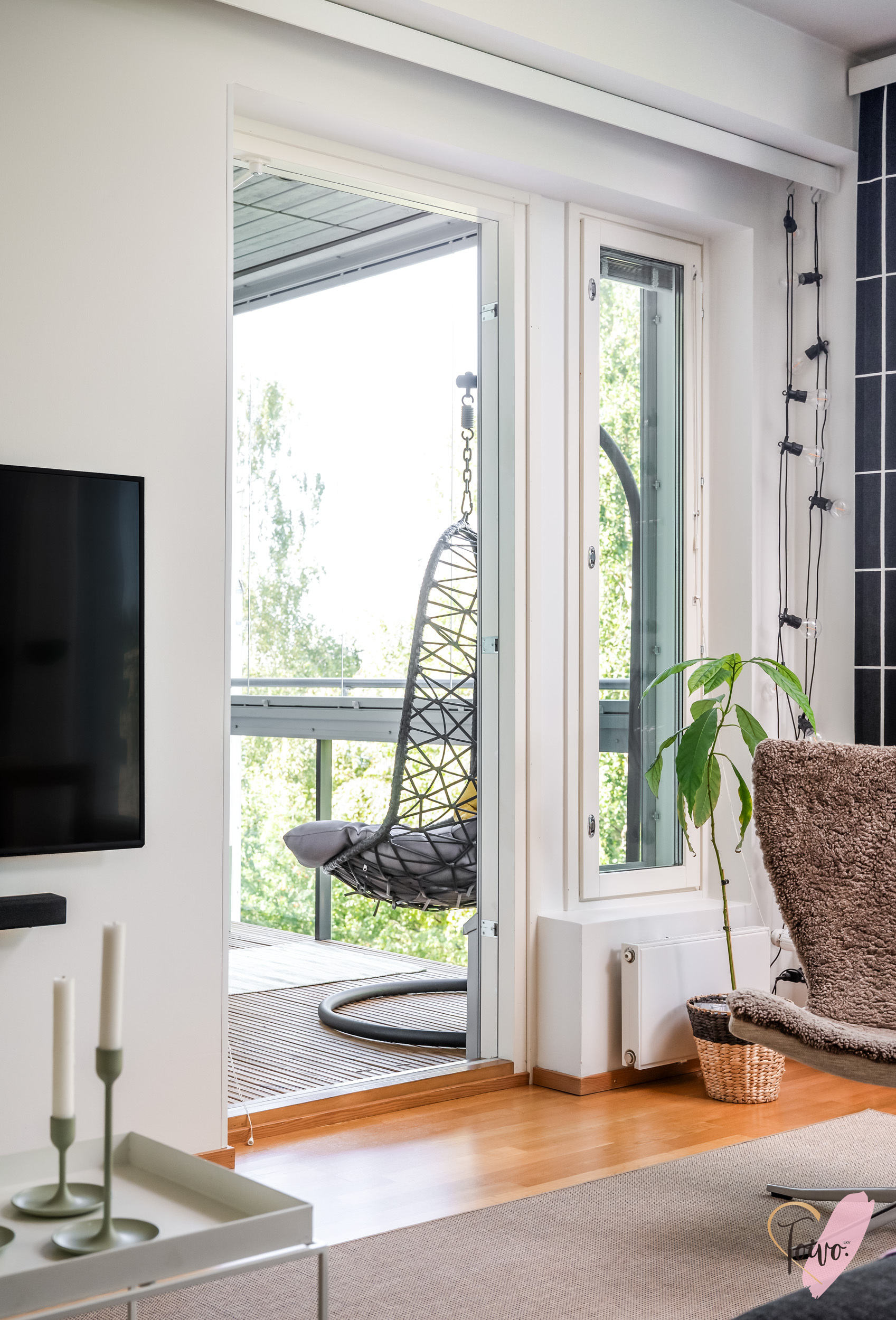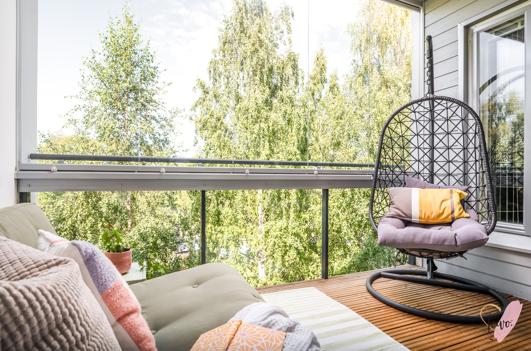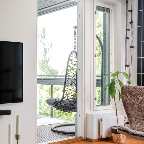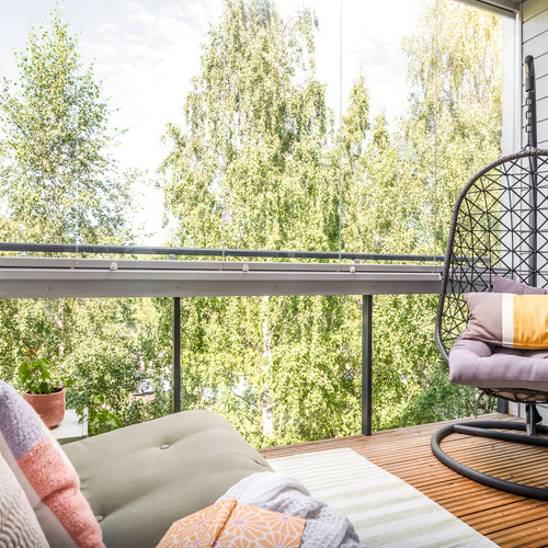 Lasitettu parveke jatkaa kodin oleskelutilaa ulos ja avaa paikan, jossa on ihanaa nauttia lempeistä kesäpäivistä ja pimenevistä syysilloista. Vuodenajat piirtyvät kauniisti puistonäkymiin. Tämä on paikka, jossa maisema saa hengittämään syvempään ja arjen kiireet unohtuvat.