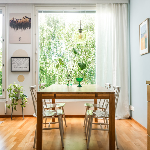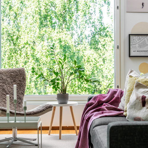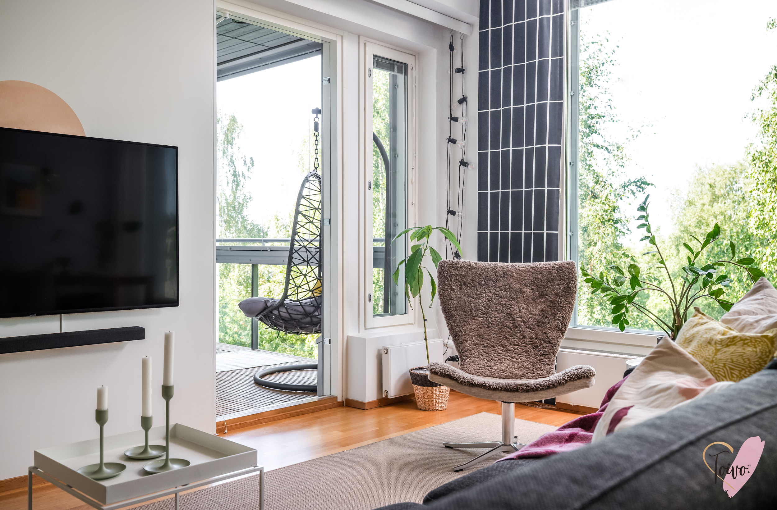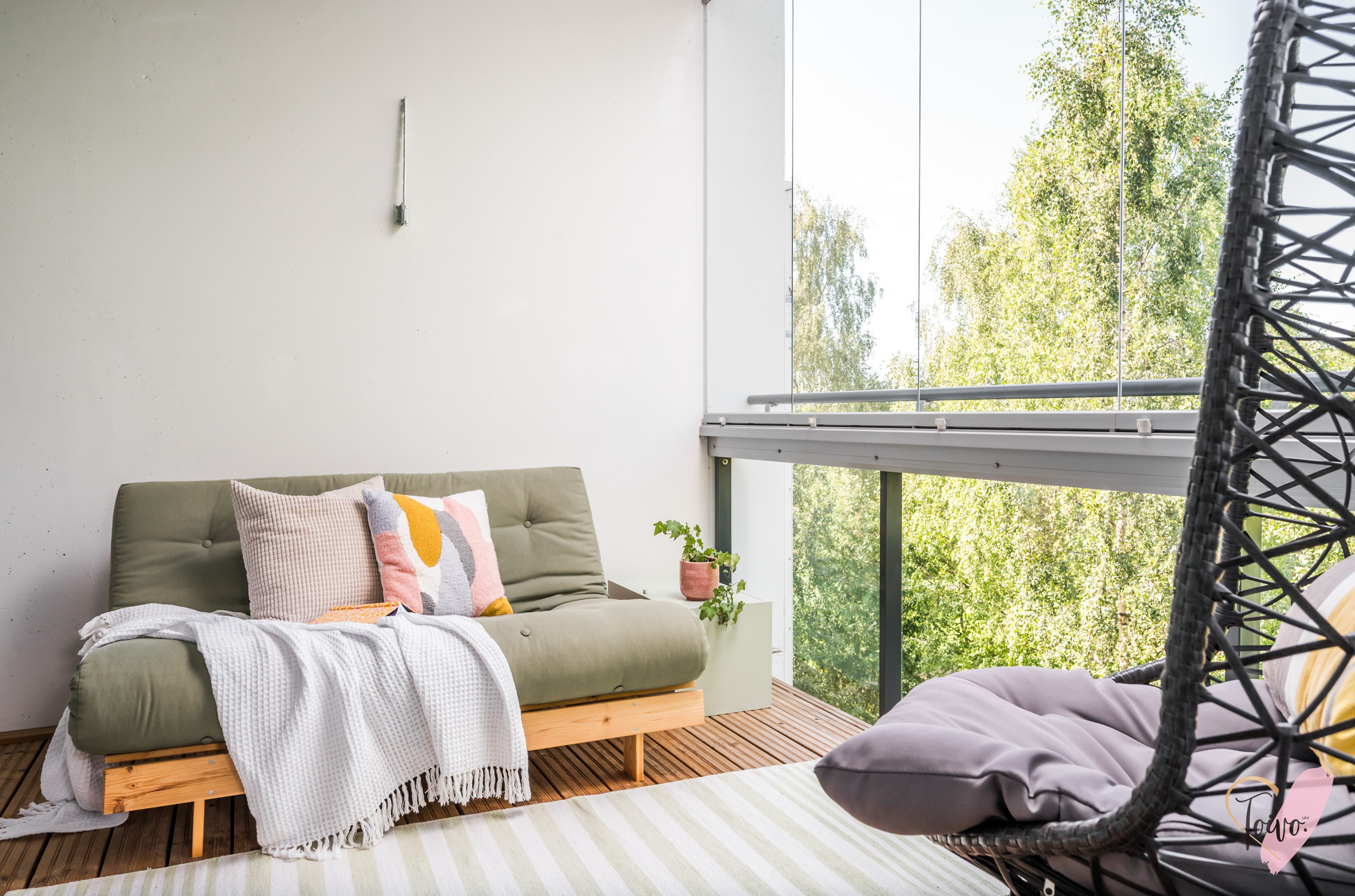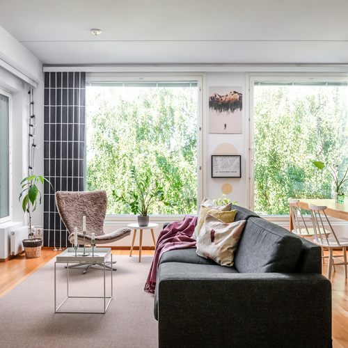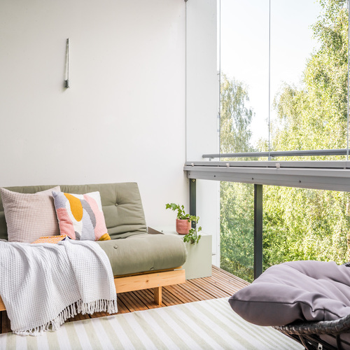 Lasitettu parveke jatkaa kodin oleskelutilaa ulos ja avaa paikan, jossa on ihanaa nauttia lempeistä kesäpäivistä ja pimenevistä syysilloista. Vuodenajat piirtyvät kauniisti puistonäkymiin. Tämä on paikka, jossa maisema saa hengittämään syvempään ja arjen kiireet unohtuvat.