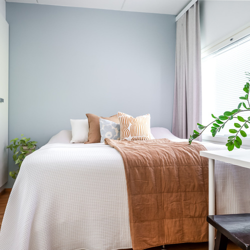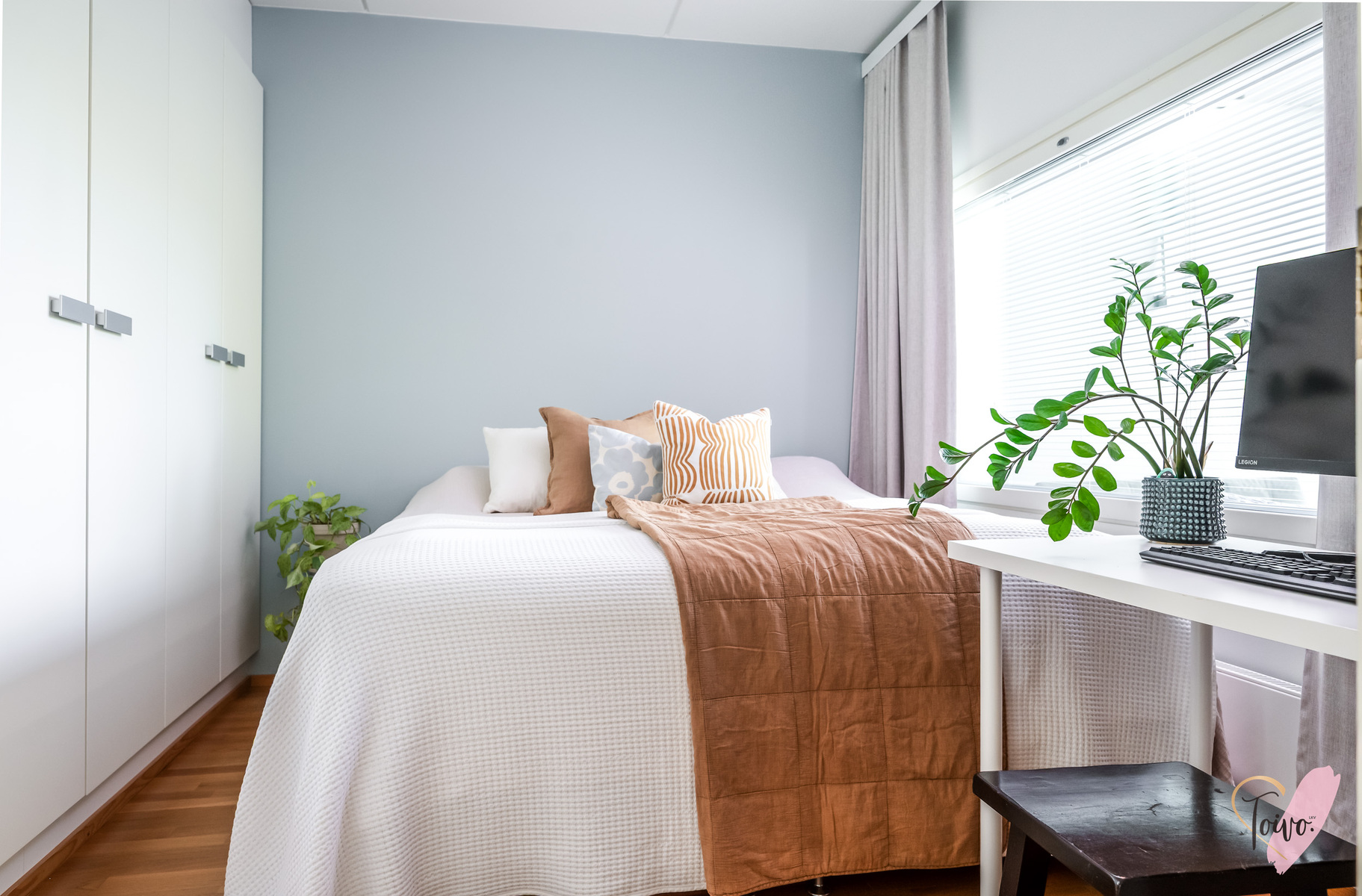 Tilava makuuhuone kutsuu levolliseen yöuneen ja täällä on tilaa vaikka näppärälle työpisteellekin, myös säilytystilaa on löytyy kaapistosta koko seinän leveydeltä.
