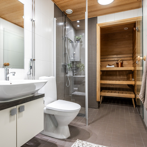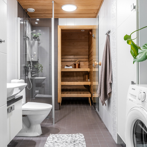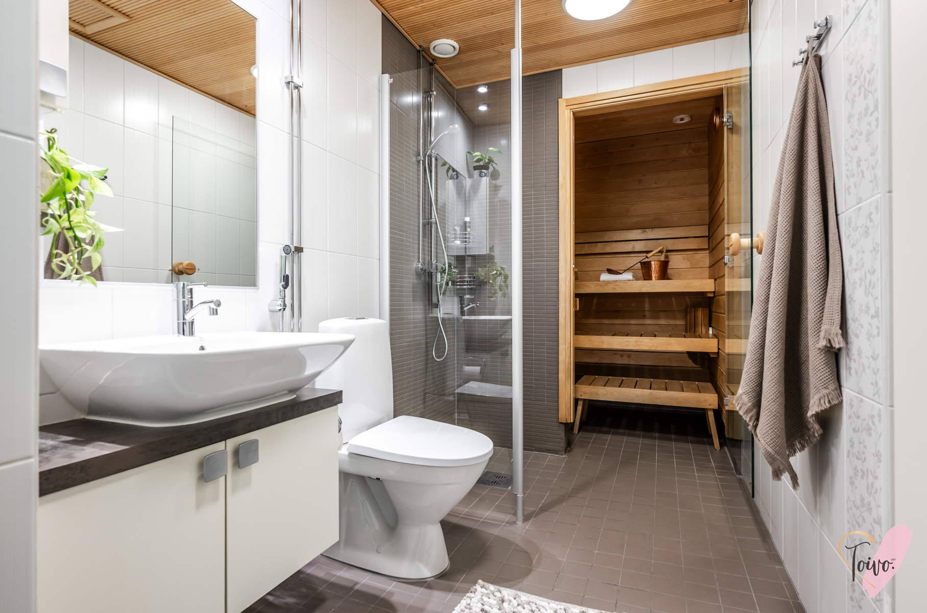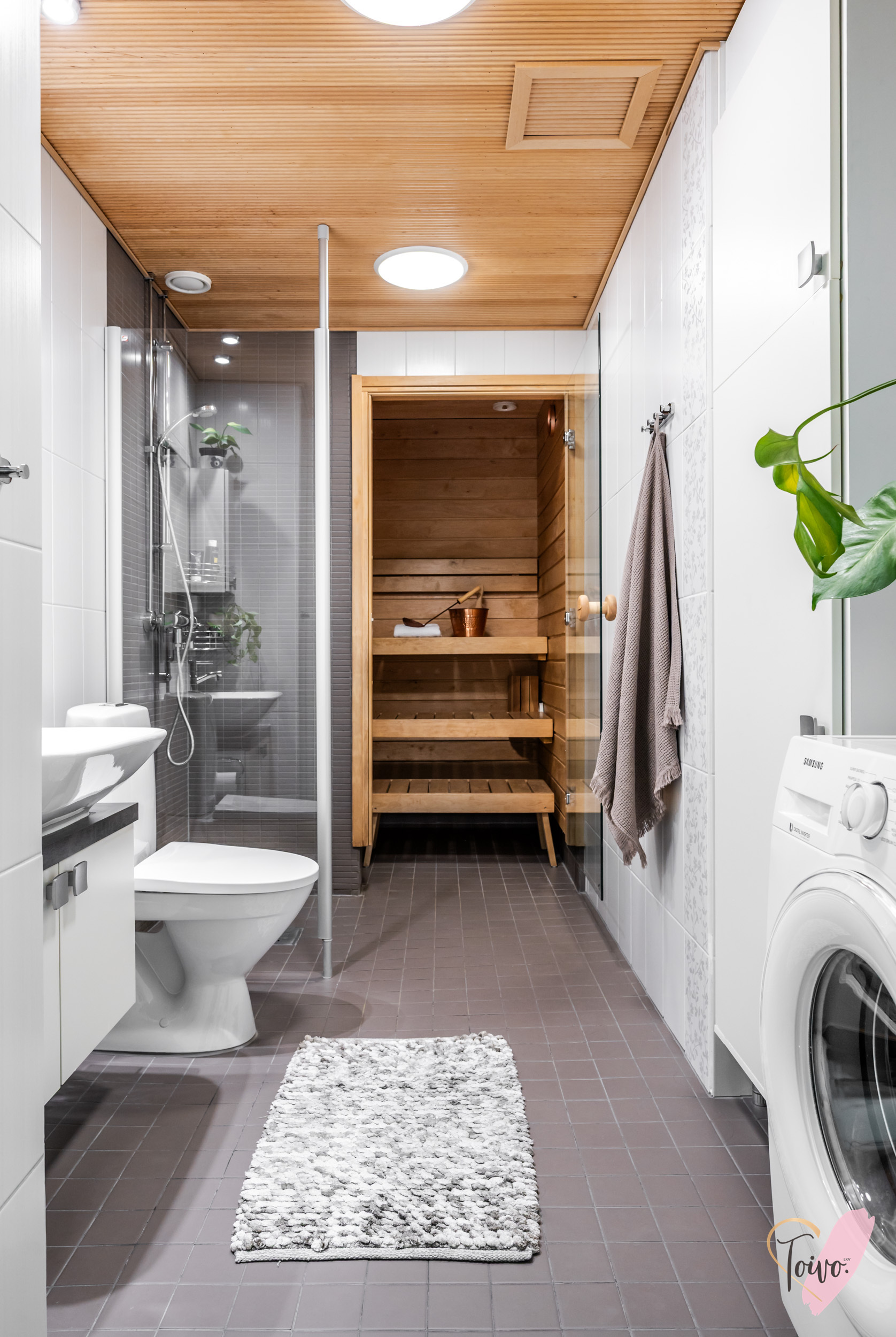 Kylpyhuoneeseen on valikoitunut kauniit, seesteiset sävyt, täällä lasiseinä suojaa suihkutilaa. Oman saunan lempeissä löylyissä on ihanaa rentoutua päivän päätteeksi. Myös pyykkihuolto sujuu käden käänteessä, tilaa on myös pyykkitornille.