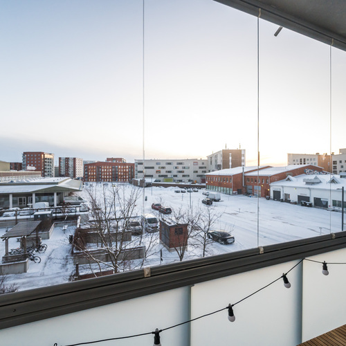 Ruokailutilan jatkeena on tilava lasitettu parveke, josta on avarat näkymät ja mikä parasta parvekkeen suunta on suoraan etelään ja kas näin, lasitettu parveke on täydellinen paikka kahvikupilliselle tai ilta-auringon fiilistelyyn.
