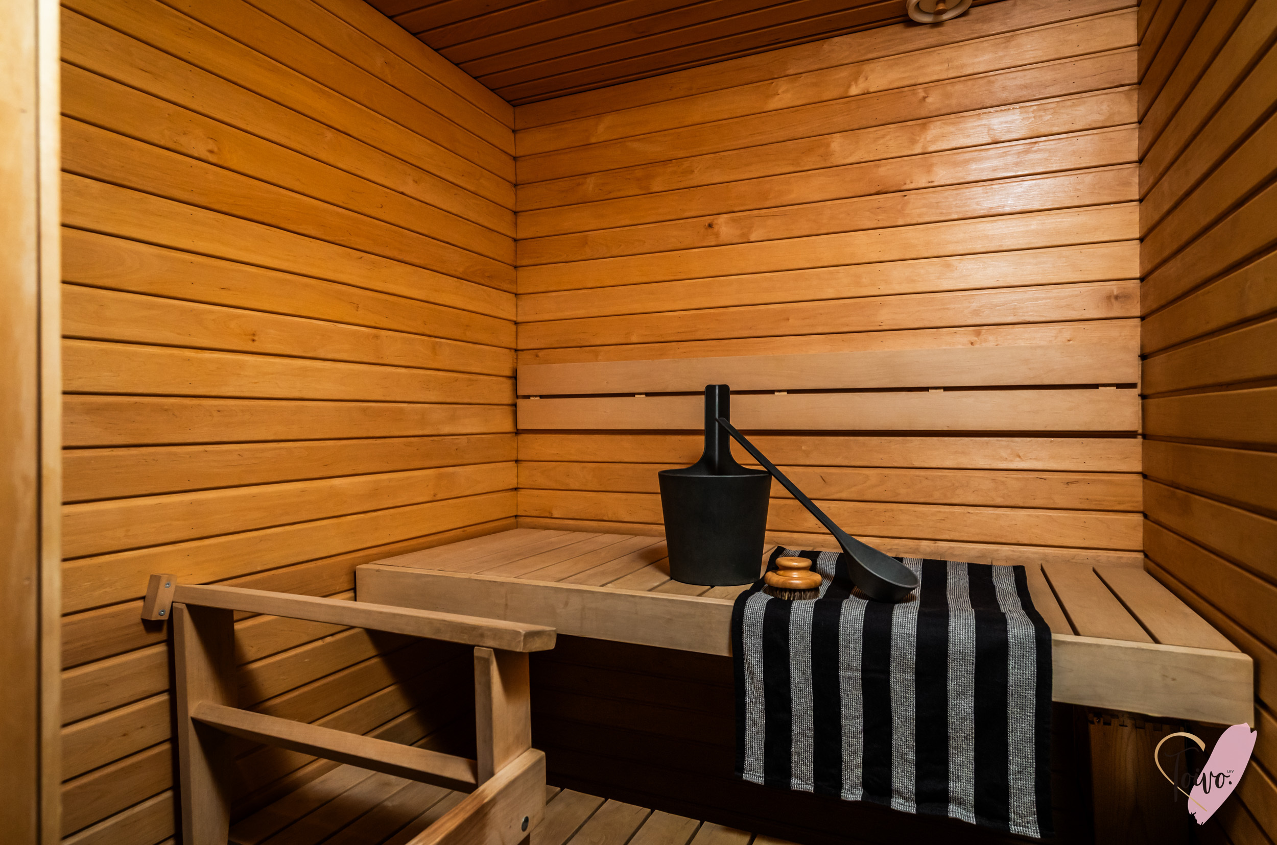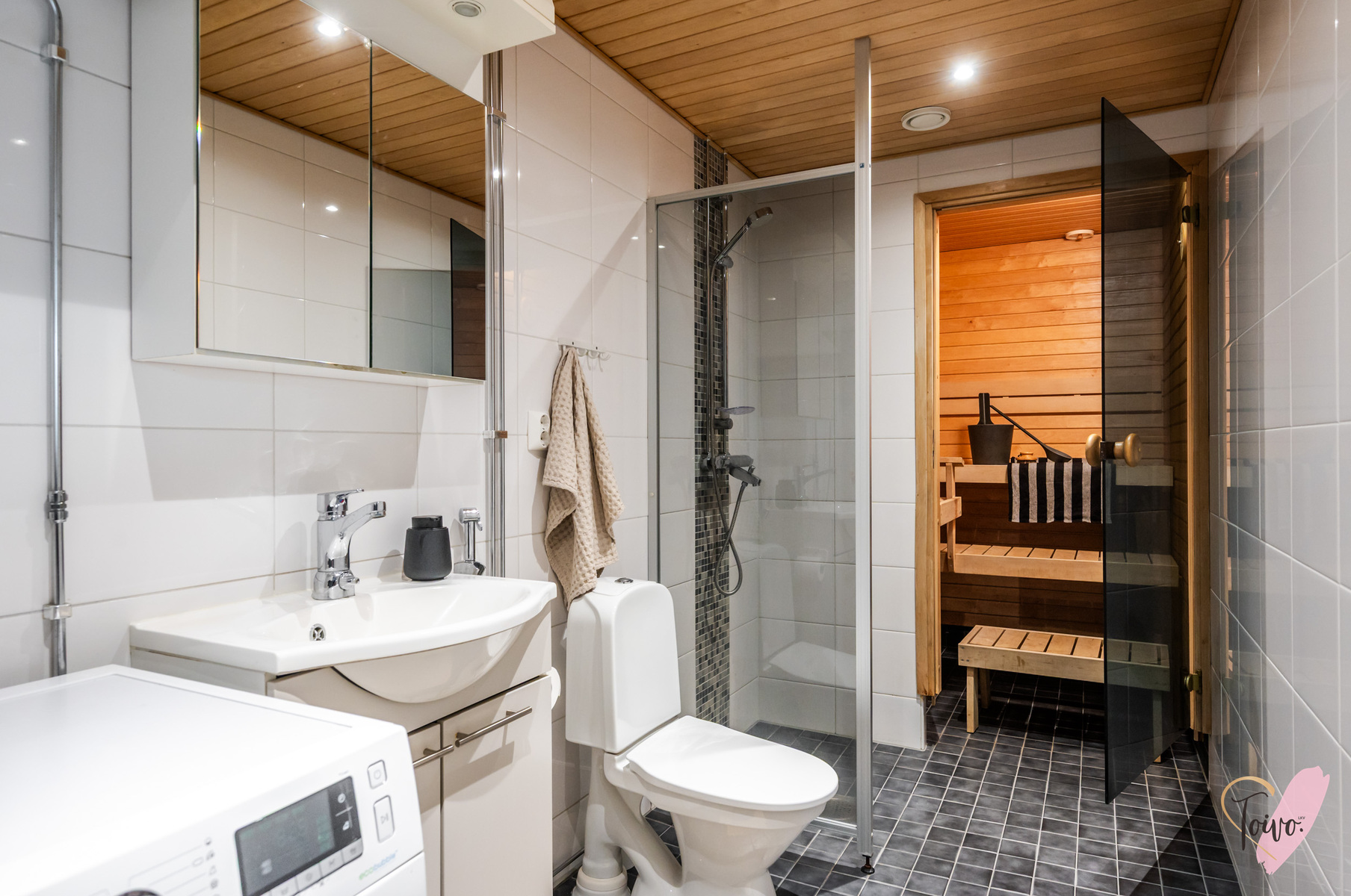 Kylpyhuoneessa on lasiseinällä rajattu suihku, paikka pesutornille, wc sekä oma sauna, jossa rentoudut päivän päätteeksi.