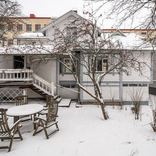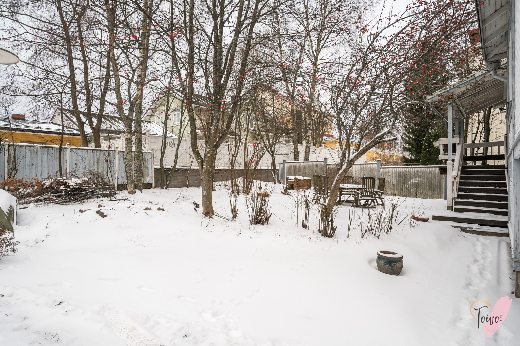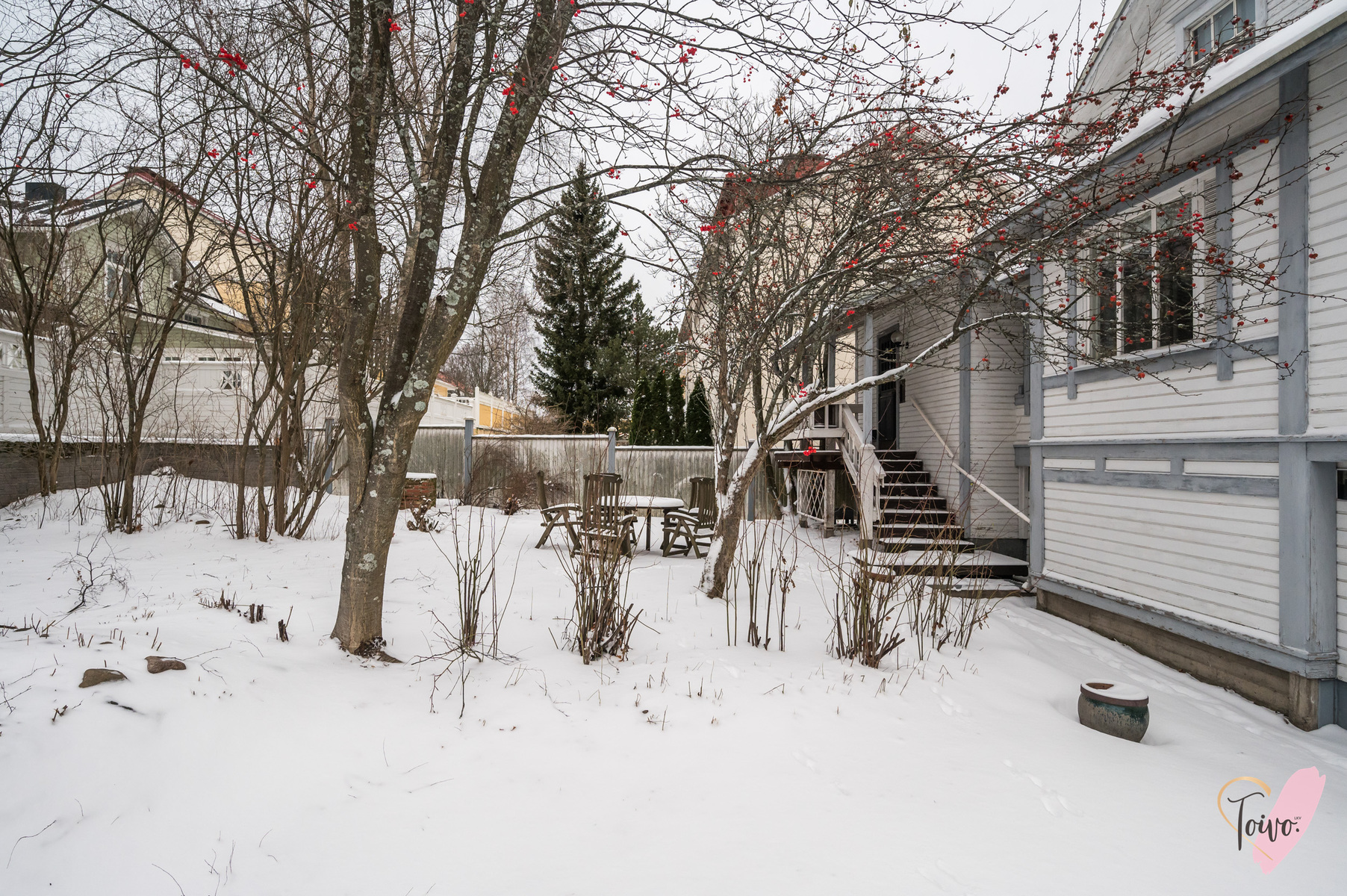 Talon ympärillä avautuu ihana ja suojaisa puutarha, joka kutsuu nauttimaan ulkoilmasta ja istumaan puiden varjossa iltapäivä teetä siemaillen. Talven tullen piha on kuin valokuvien winter wonderland.
