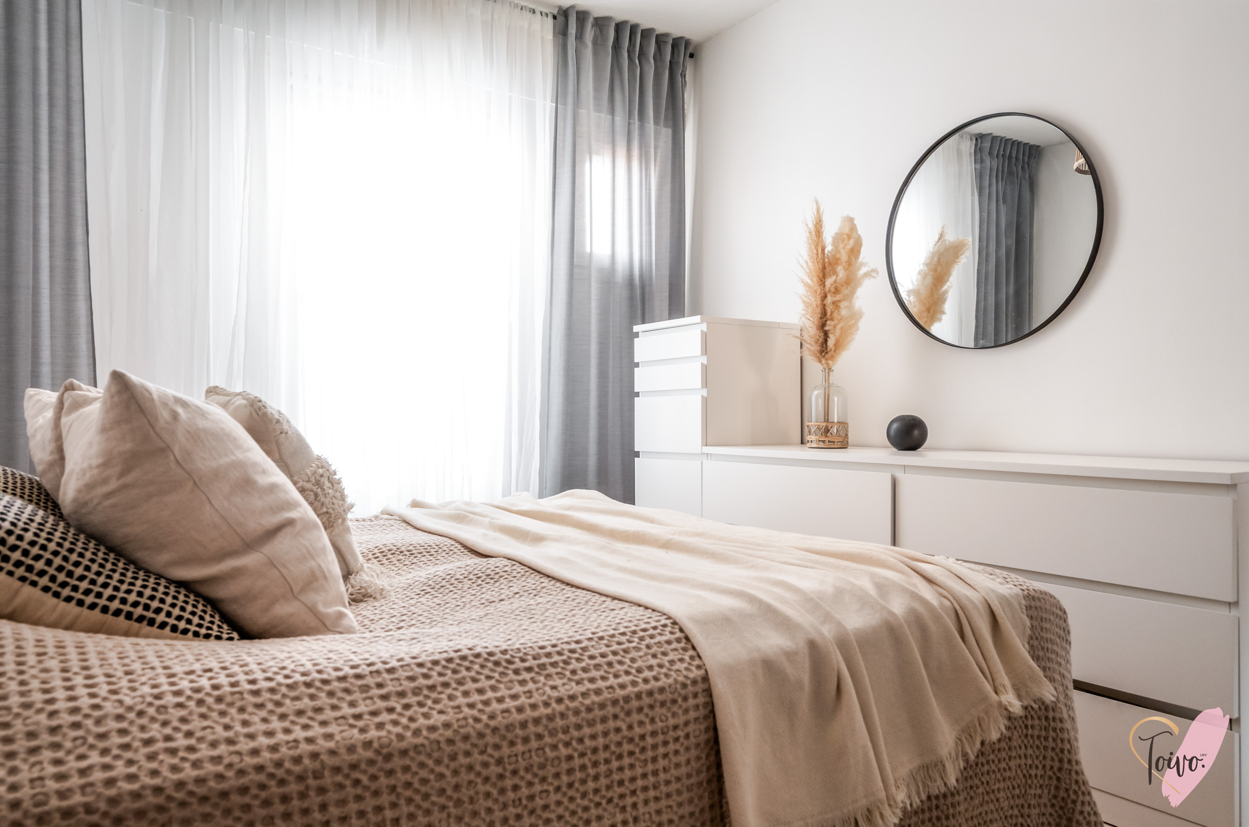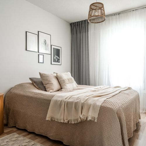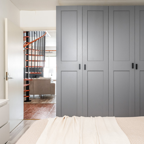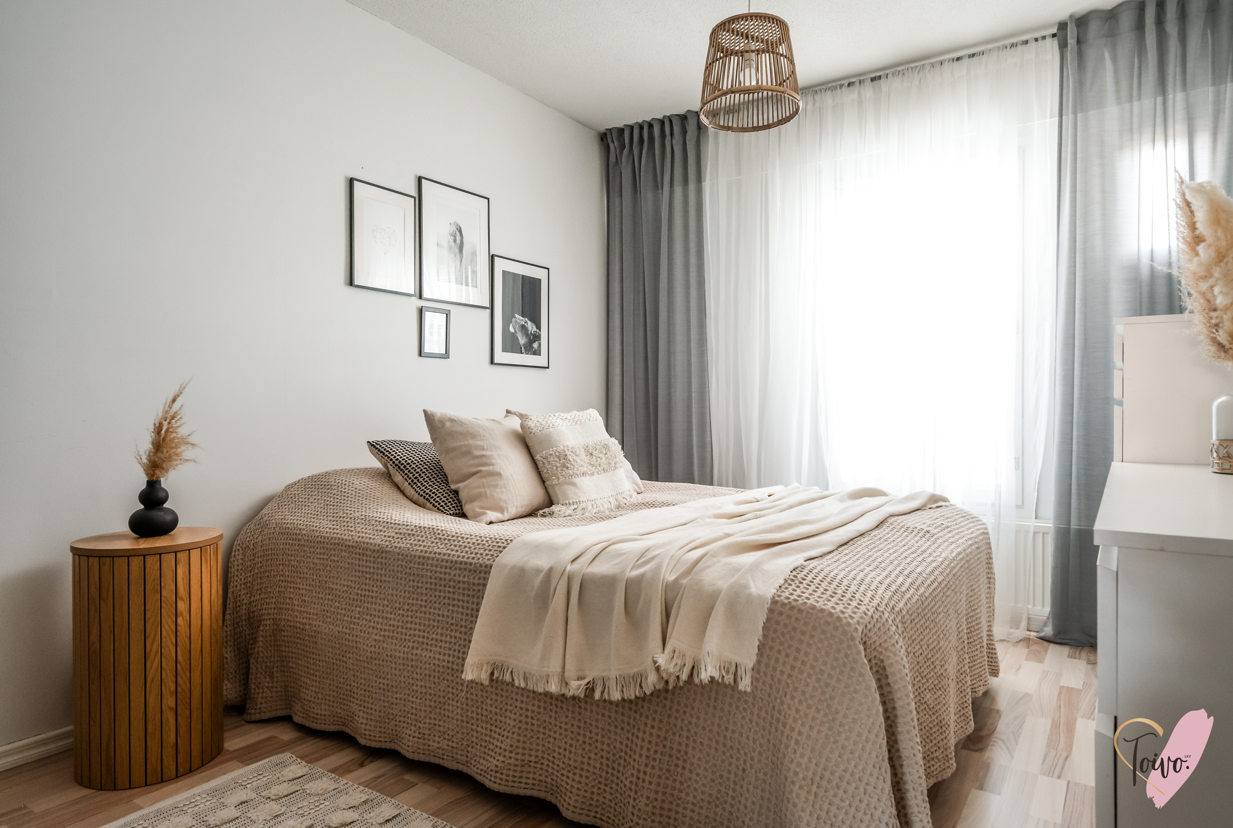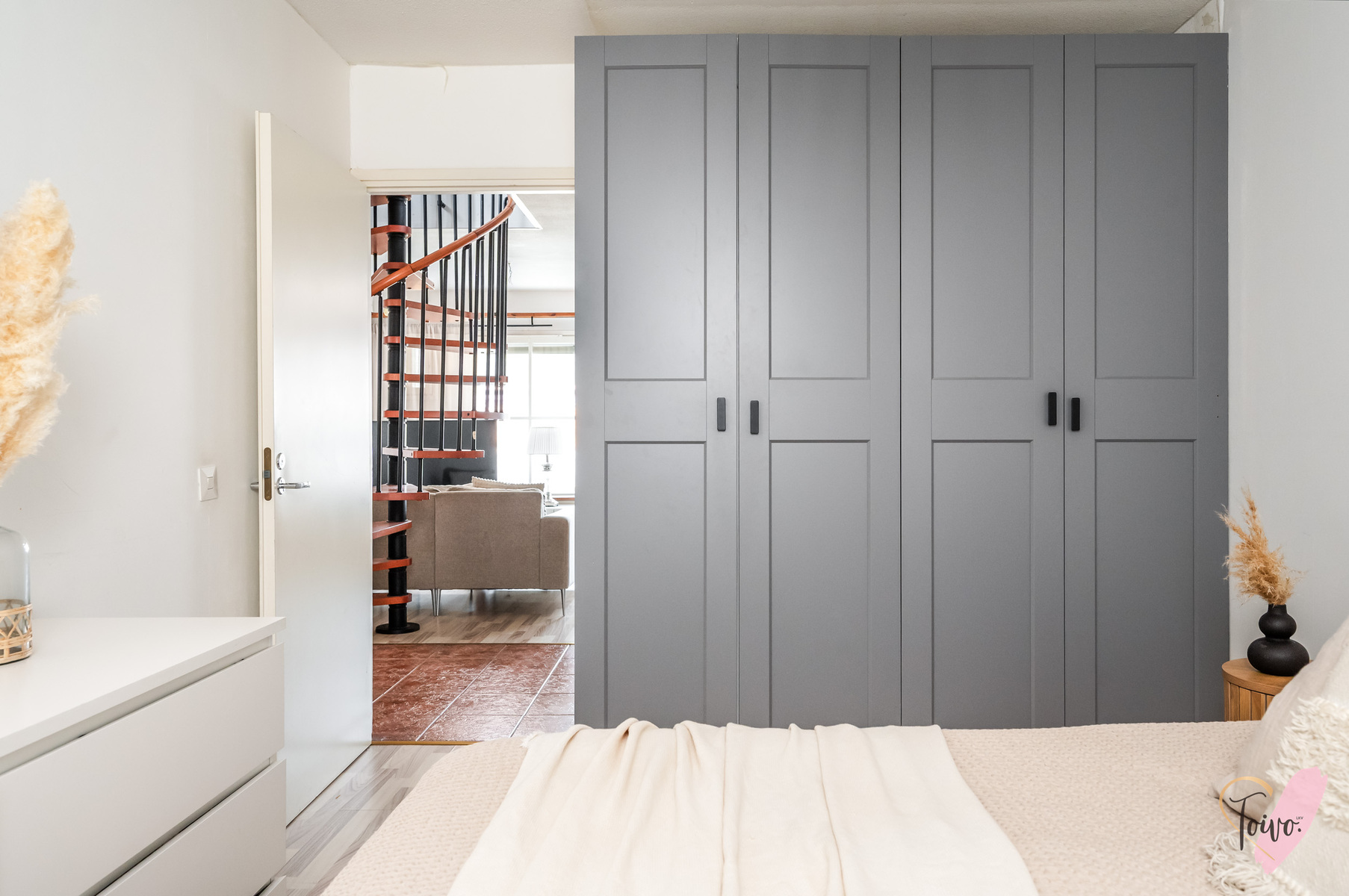 Sisään astutaan suoraan kodin keskelle, josta tilat jakautuvat luontevasti kahteen suuntaan. Oikealla odottaa levollinen makuuhuone, jossa on reilusti tilaa suuremmallekin parisängylle ja vieläpä työpöydälle, jos arki sitä kaipaa. Säilytystilaa on koko seinän leveydeltä siistien kaapistojen takana, joten huone pysyy helposti harmonisena ja selkeänä.