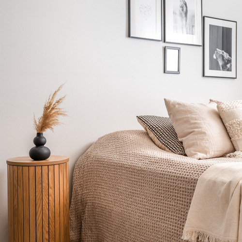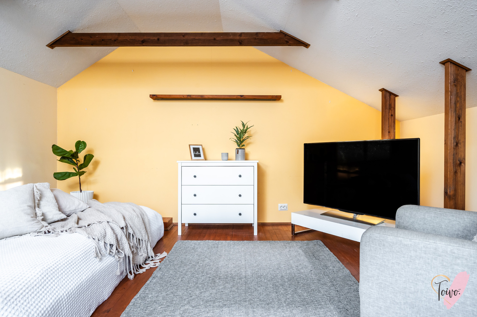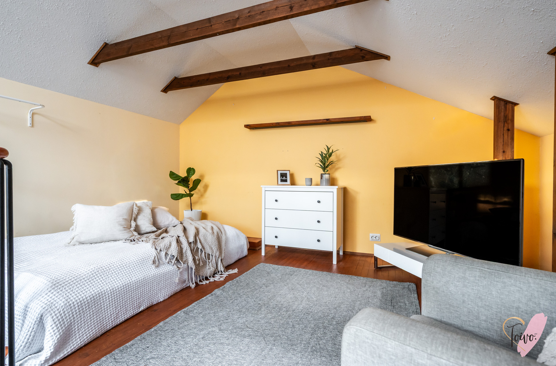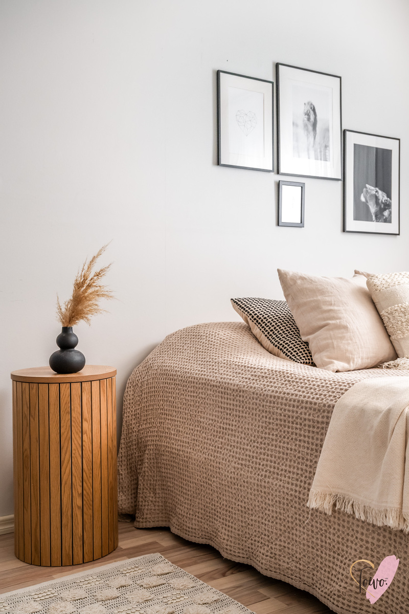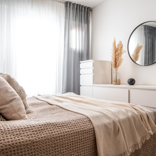 Sisään astutaan suoraan kodin keskelle, josta tilat jakautuvat luontevasti kahteen suuntaan. Oikealla odottaa levollinen makuuhuone, jossa on reilusti tilaa suuremmallekin parisängylle ja vieläpä työpöydälle, jos arki sitä kaipaa. Säilytystilaa on koko seinän leveydeltä siistien kaapistojen takana, joten huone pysyy helposti harmonisena ja selkeänä.