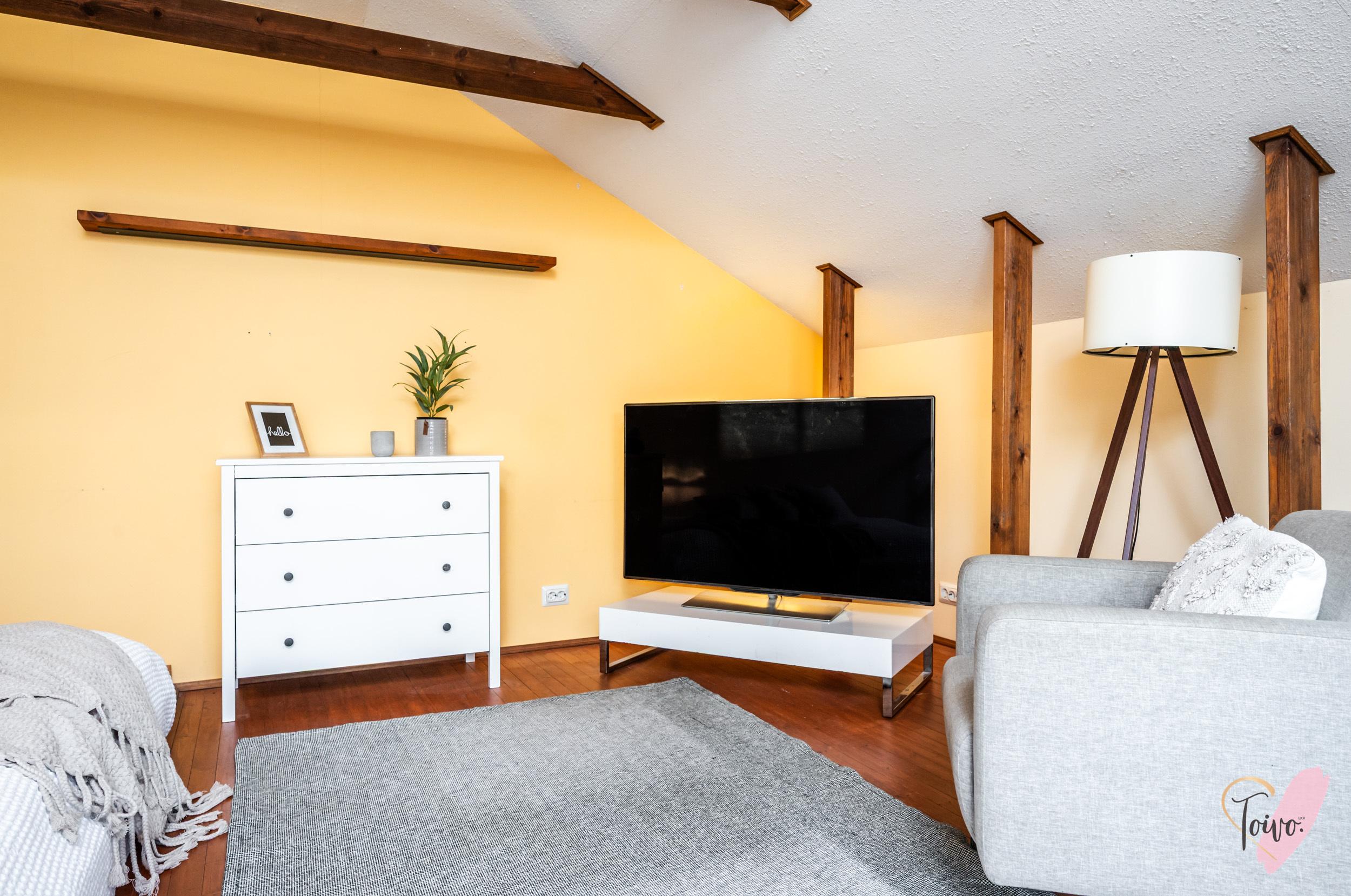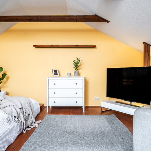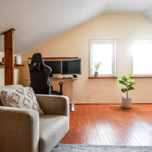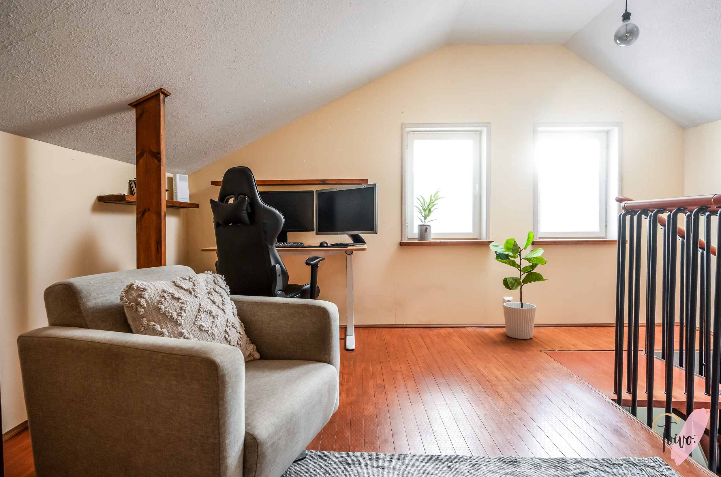 Tämän kodin erityinen helmi on yläkertaan rakennettu tilava parvi, jonne kauniit kierroportaat johdattavat. Tila tuo asumiseen lisää monipuolisuutta. Parvi toimii loistavasti esimerkiksi työhuoneena, vierashuoneena tai lisämakuutilana. Näkyviin jätetyt kattoparrut ja vinokatto tuovat tilaan persoonallisuutta ja kodikasta ullakon tunnelmaa.
