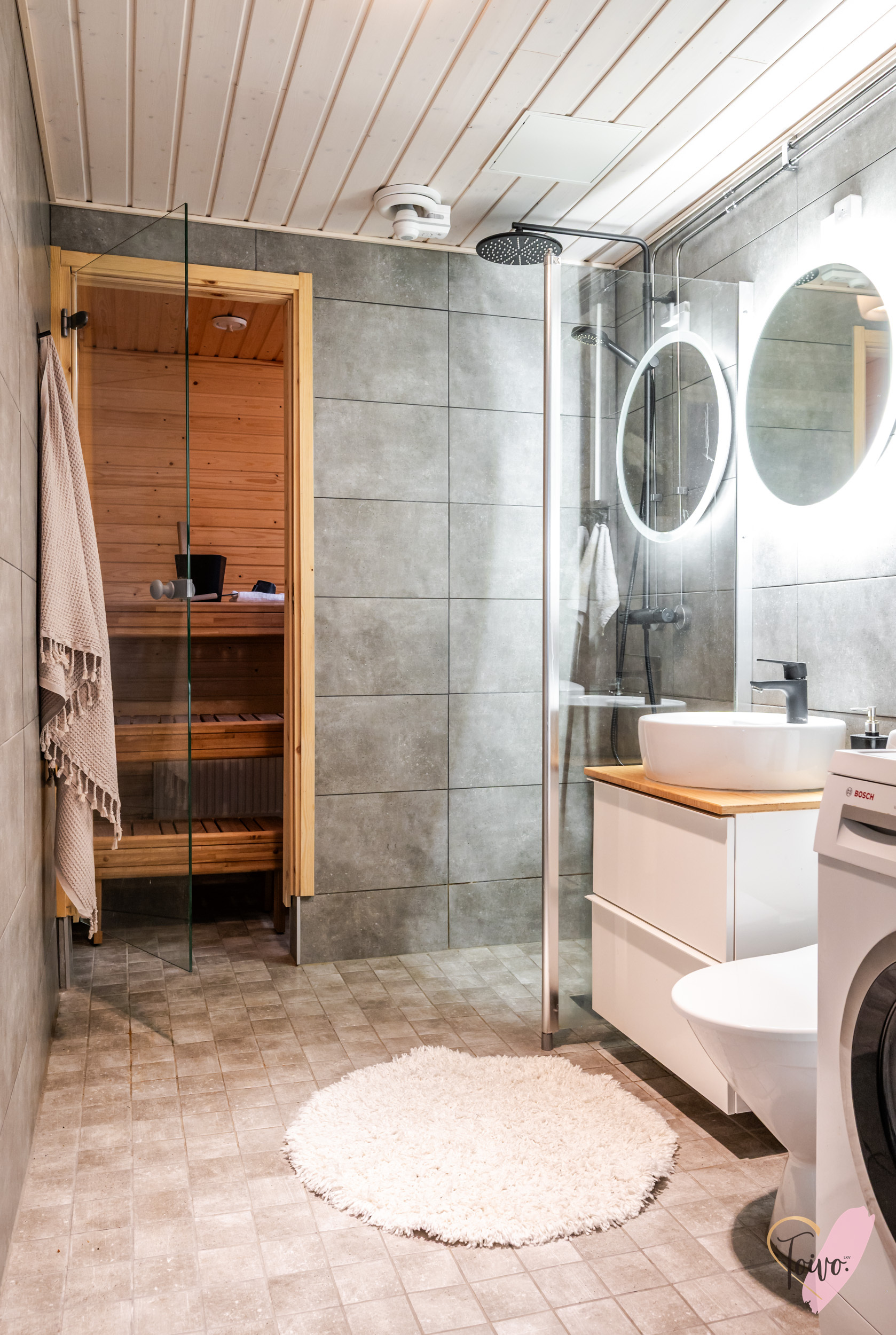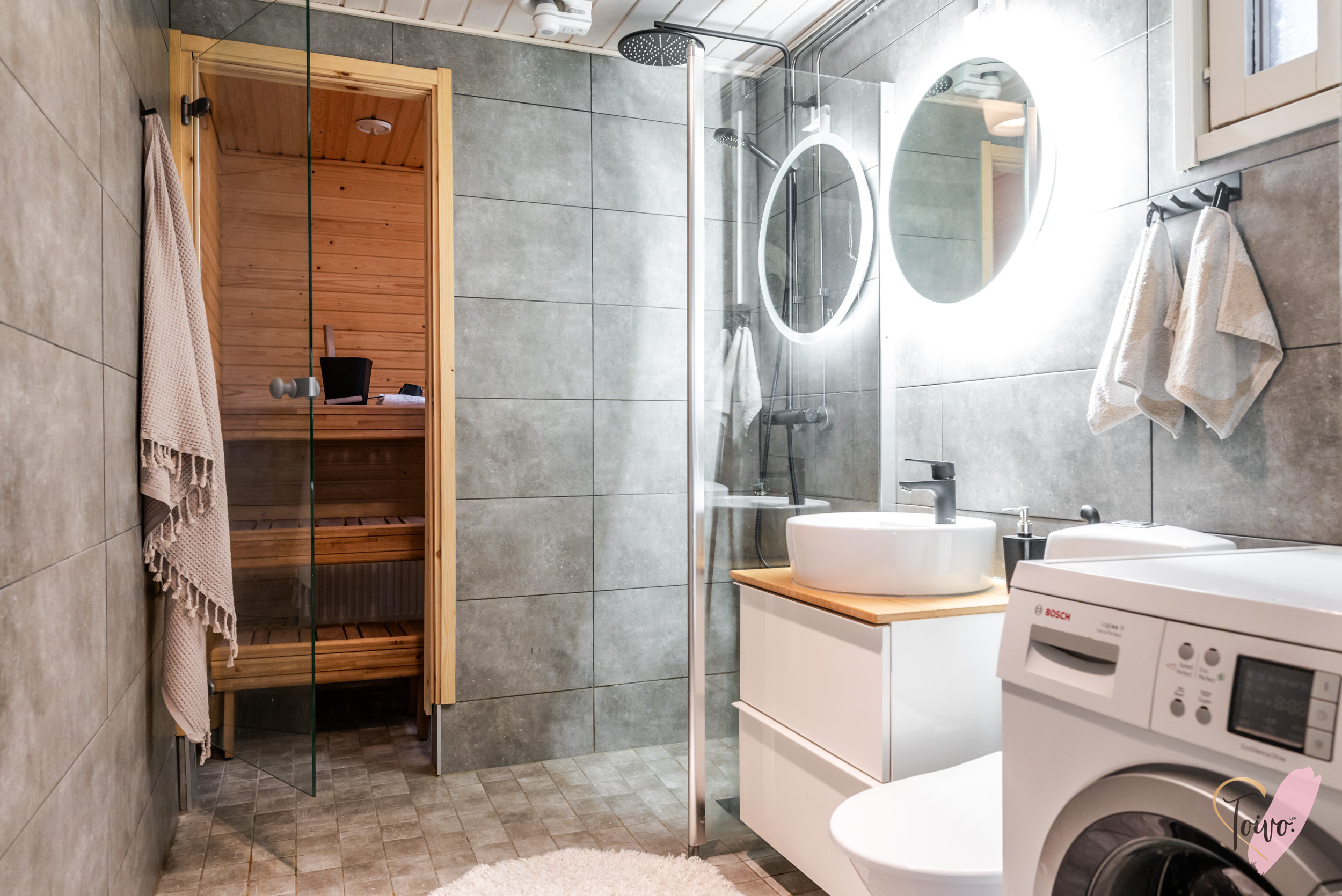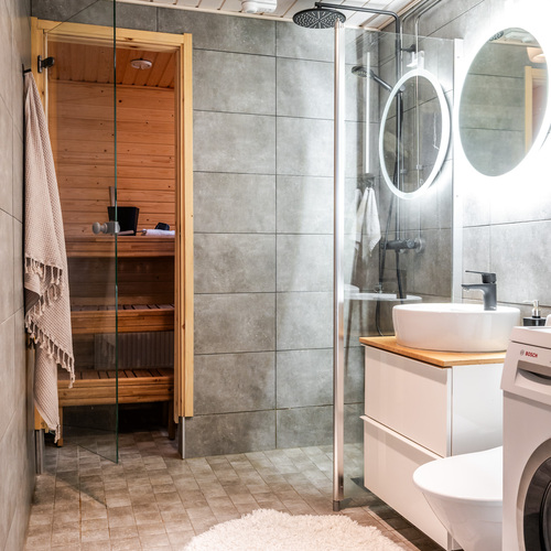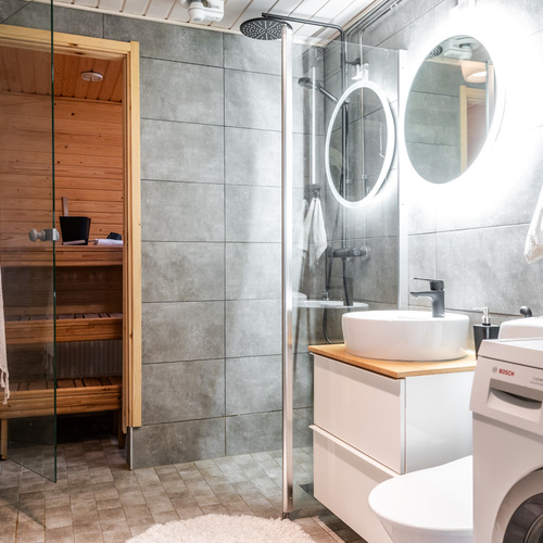 Kylpyhuone on tyylillä remontoitu. Tummat, tunnelmalliset laatat ja mustat vesikalusteet luovat modernin ilmeen, jota kaunis malja-allas täydentää elegantisti. Pyykinpesukoneelle on oma käytännöllinen paikkansa ja tilasta on suora kulku saunaan, jossa pääset nauttimaan lempeistä löylyistä kiireisen päivän jälkeen.