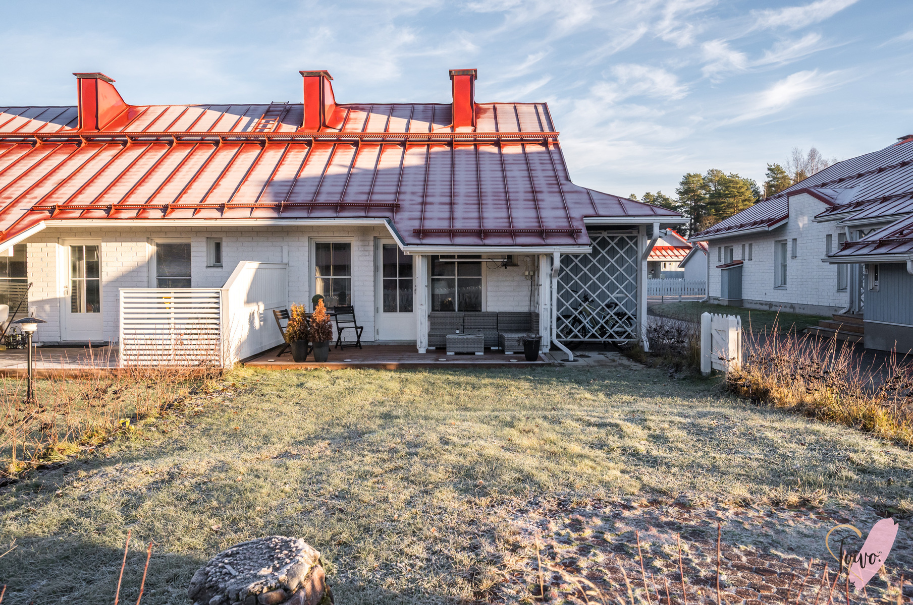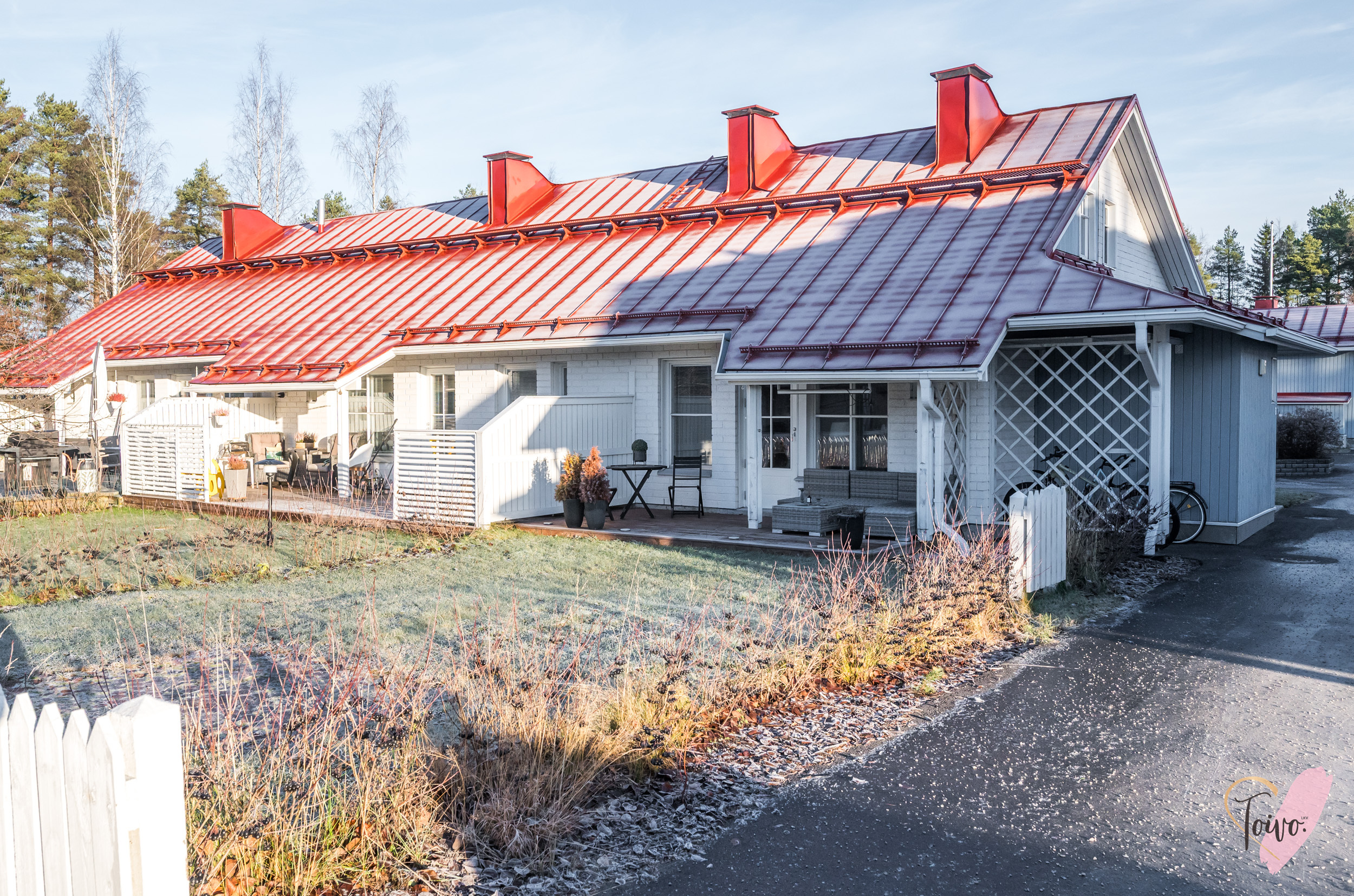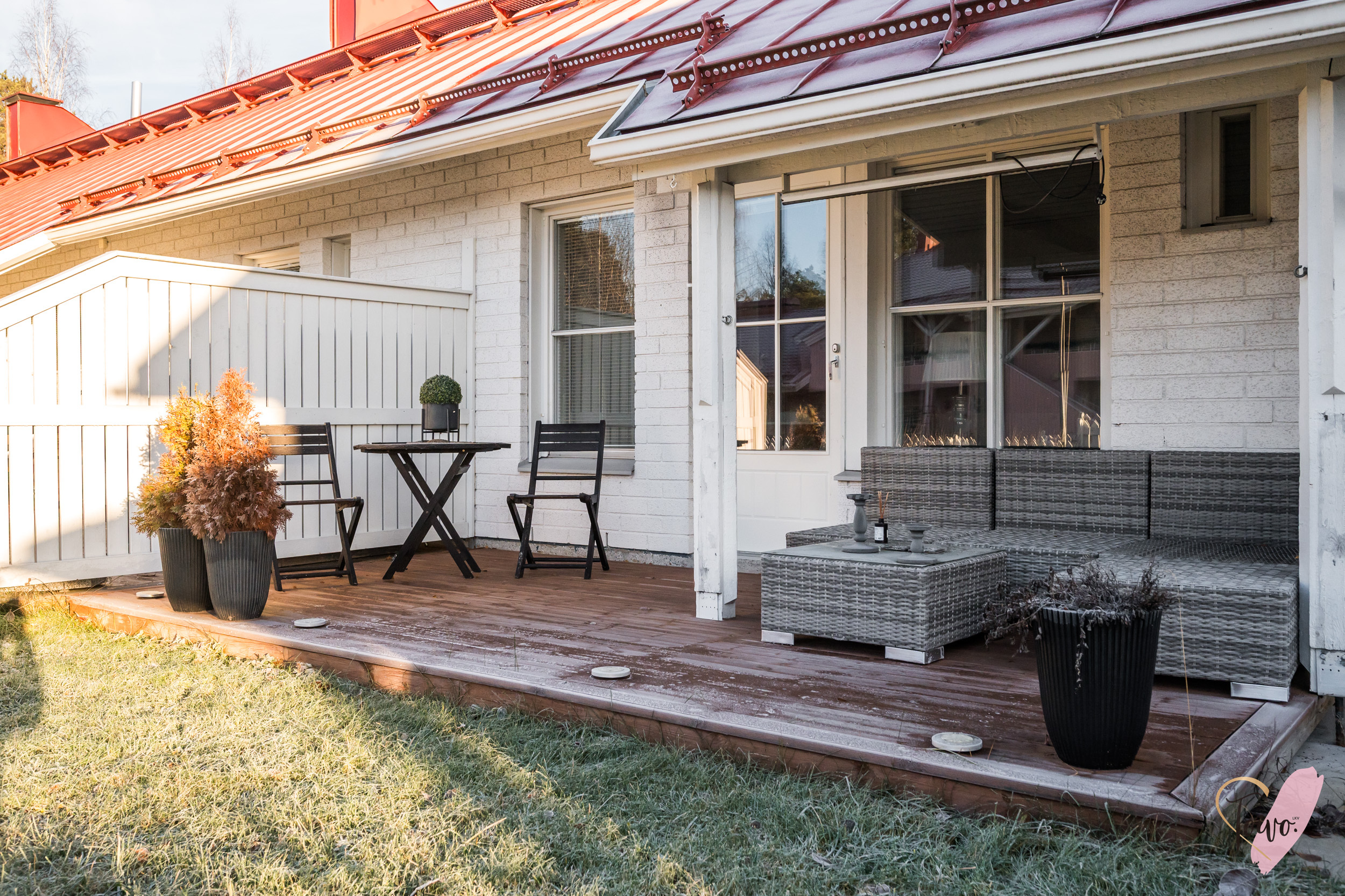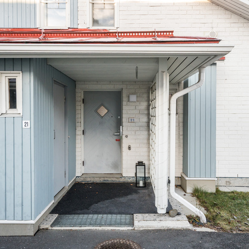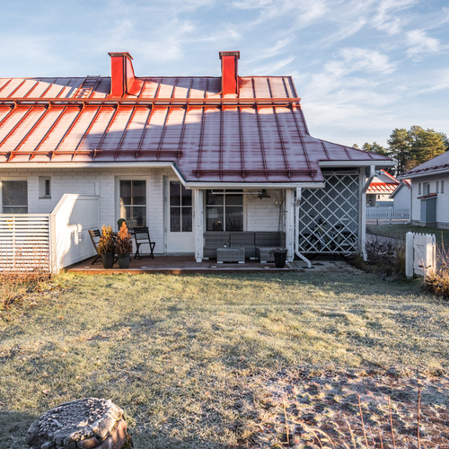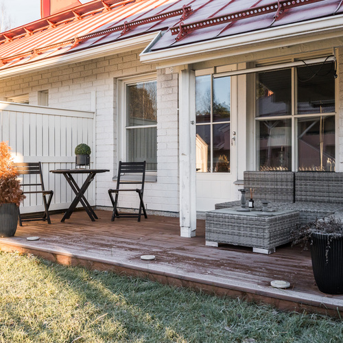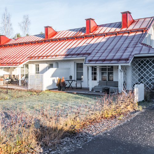 Päätyasunnon sijainti tuo asumiseen rauhaa ja yksityisyyttä. Oma piha tarjoaa tilaa kesästä nauttimiseen ja terassilla on mukavasti tilaa istuskeluun tai vaikka kukkien hoitamiseen.