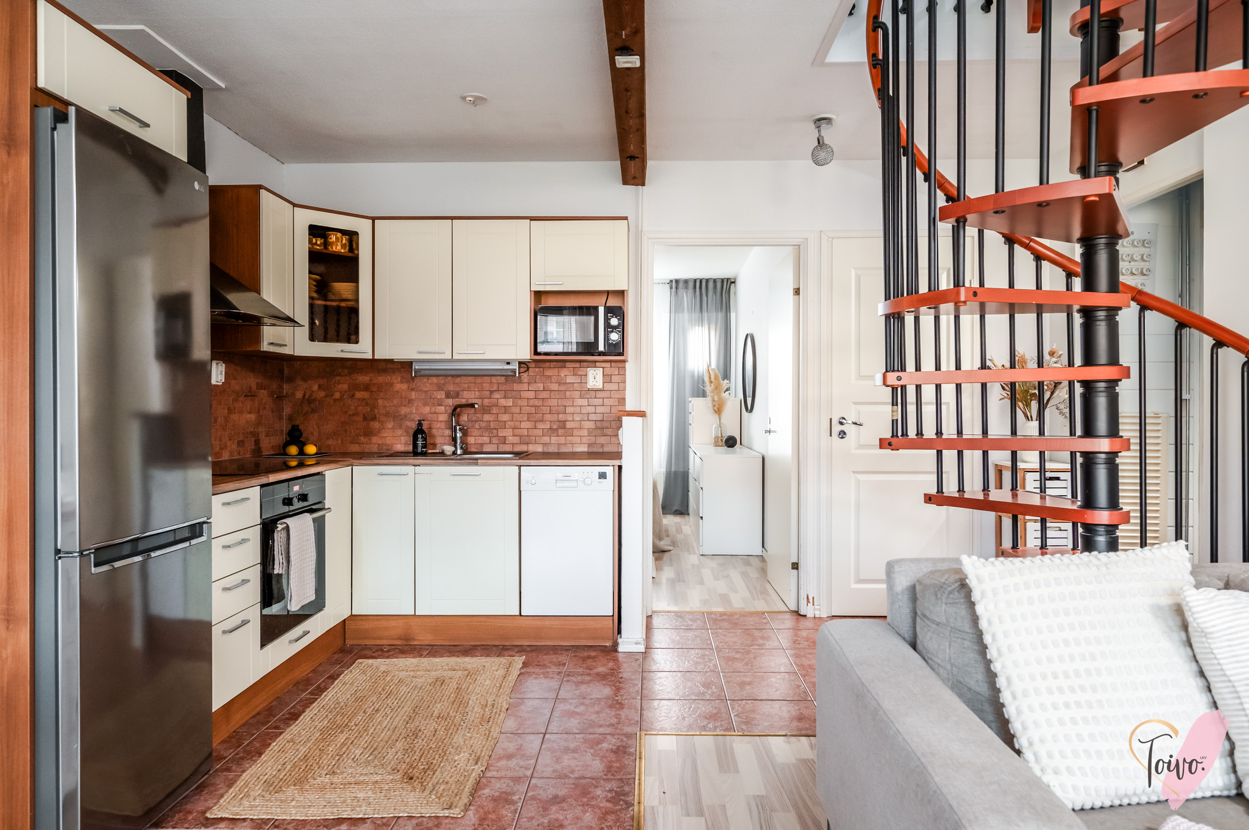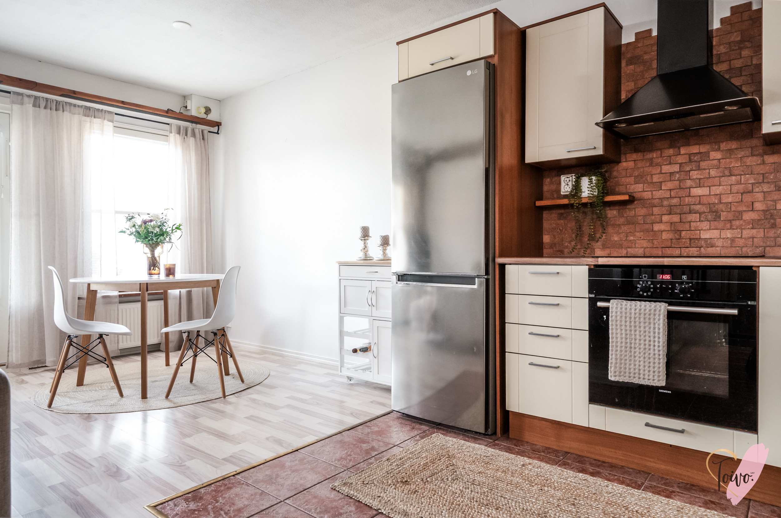 Vasemmalle avautuu valoisa oleskelutila, joka yhdistyy saumattomasti keittiöön. Kahdelle seinälle sijoitettu keittiö tarjoaa juuri sopivasti työskentely- ja säilytystilaa ja ruokailuryhmälle on oma paikkansa ikkunan edessä. Tässä on täydellinen paikka aamukahville, sillä näkymä avautuu omalle piha-alueelle, jossa voit nauttia vuodenaikojen vaihtelusta ja vehreydestä. Olohuoneen puolella on hyvin tilaa niin rentoutumiseen kuin yhdessäoloon ja ikkunoista tulviva luonnonvalo tekee tilasta kutsuvan ja avaran.